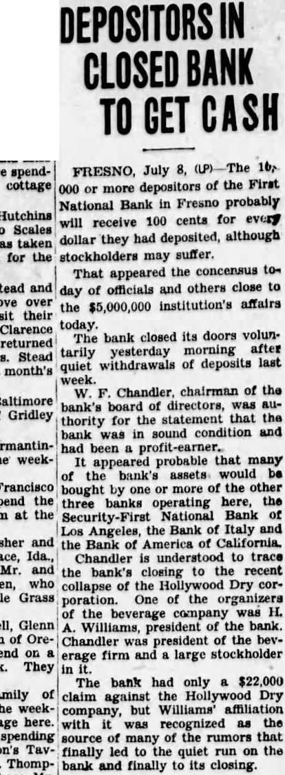 July the or depositors Bank Fresno probably National 100 cents for will receive had deposited, although they stockholders suffer. may concensus toThat appeared the and others close to day of officials institution's affairs the today. closed its doors volunThe bank morning after tarily yesterday withdrawals of deposits last chairman of the Chandler, bank's board of directors, statement that the thority for the in sound condition and bank was been probable that many appeared bank's assets would the more of the other bought by banks here, the three operating National Bank of the Bank of Italy and Angeles, the Bank America of Chandler understood to trace the bank's closing to recent collapse of the Hollywood Dry poration. One the organizers the beverage company Williams, president of the bank. Chandler president of the bevfirm large stockholder erage The bank had only claim against Dry but Williams' affiliation company, with was recognized the the rumors that many finally led the quiet run the and finally to its closing.