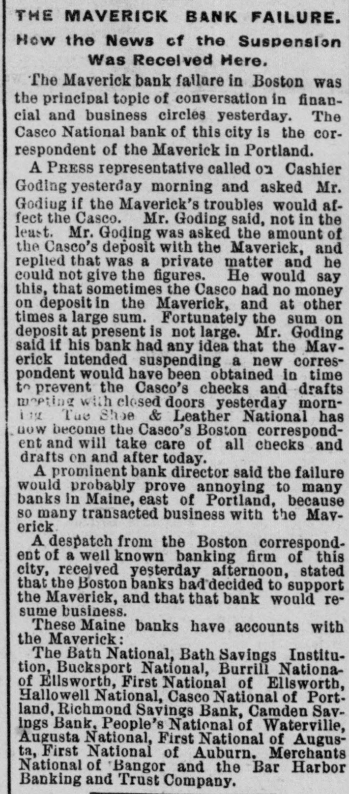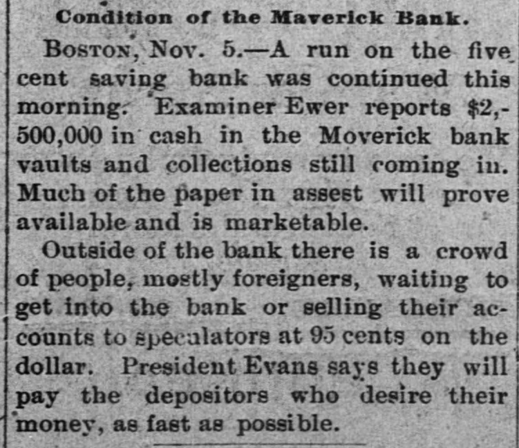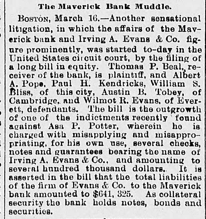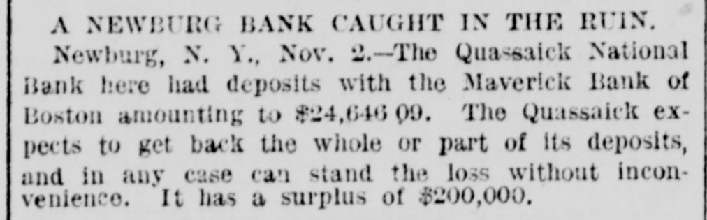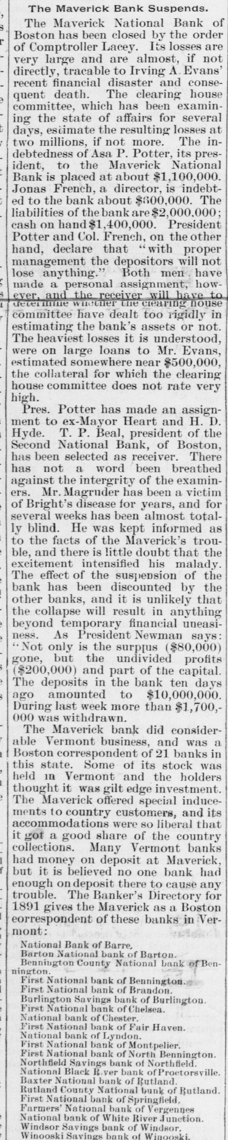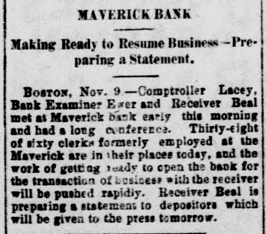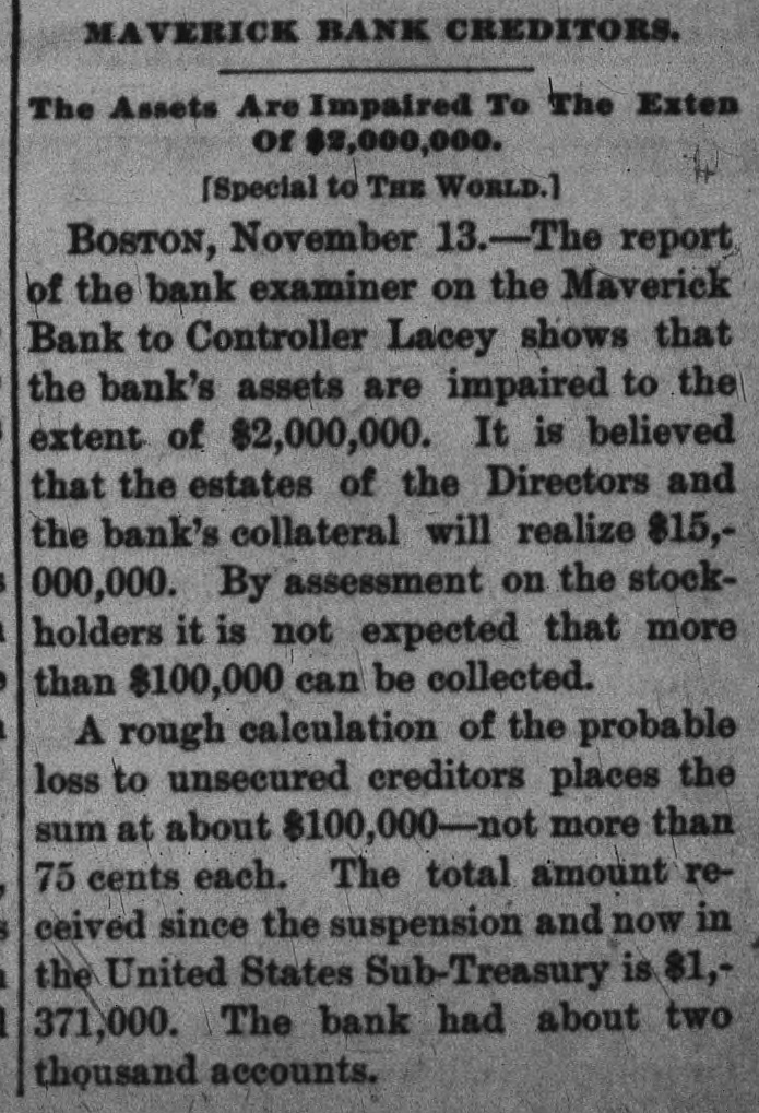 THE 551 claims proved at the Maverick bank, Boston, aggregate about $1,800,000. The receiver has deposited with the United States sub-treasury $90,000, making a total of $2,300,000 now standing to the credit of the bank's creditors.