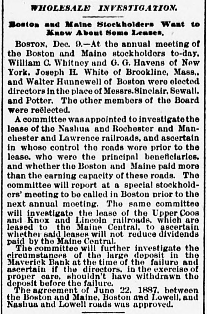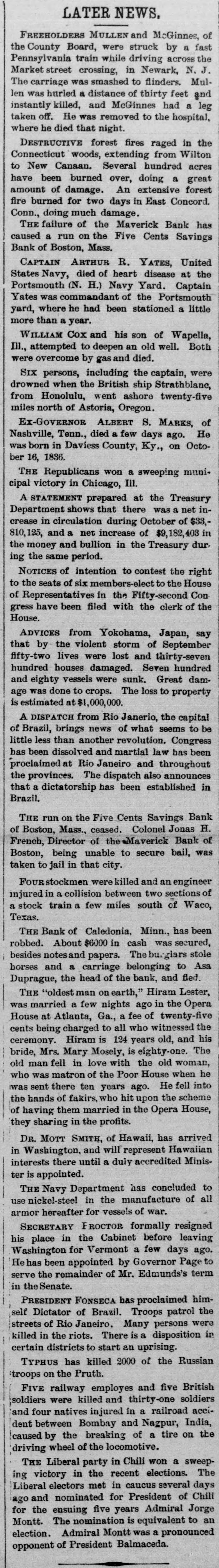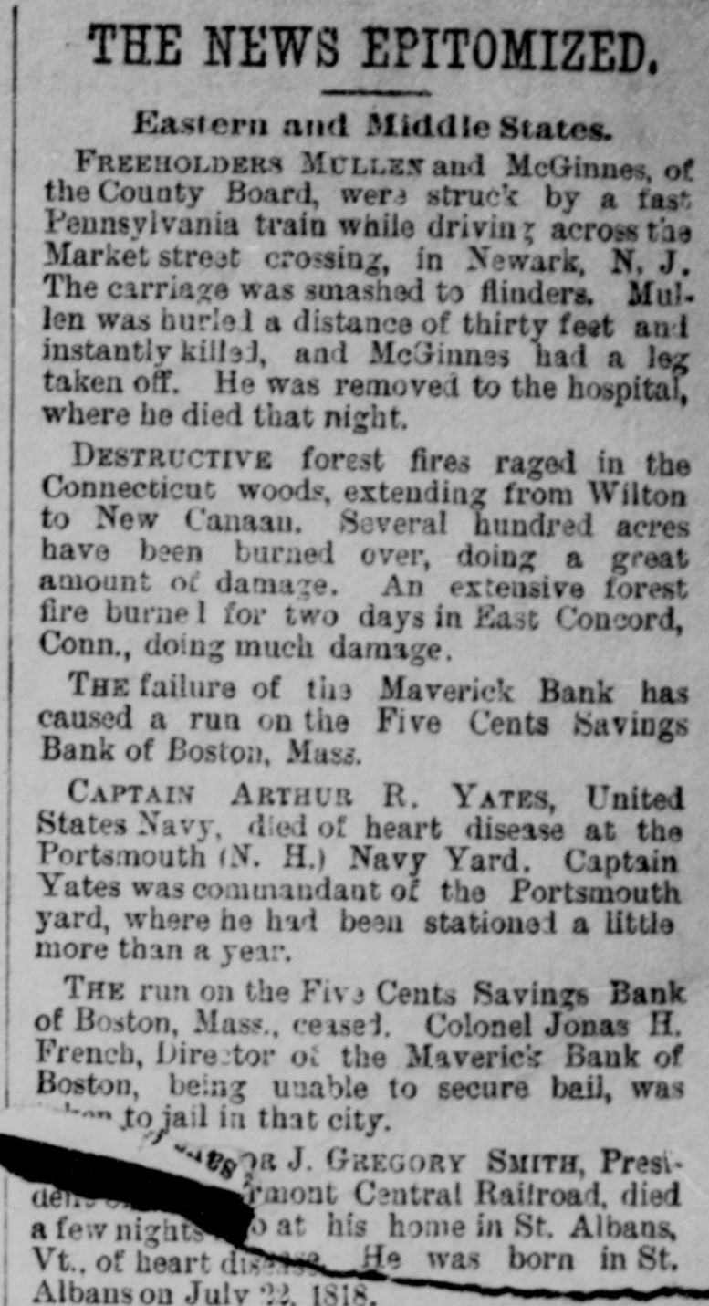By an accident on the New England road near Boston on the 4th caused by a passenger train running into a freight train at a crossing, five persons were killed outright and another burned to death in the smoker, which took fire and was consumed. The passenger train on the Long Island road was passing on a track alongside at the time of the accident and it too crashed into the wreck, piling up three trains together.