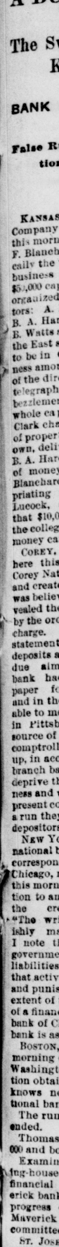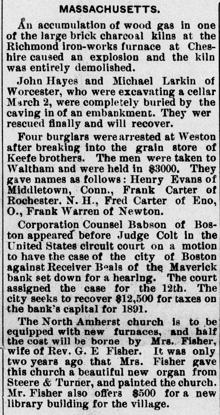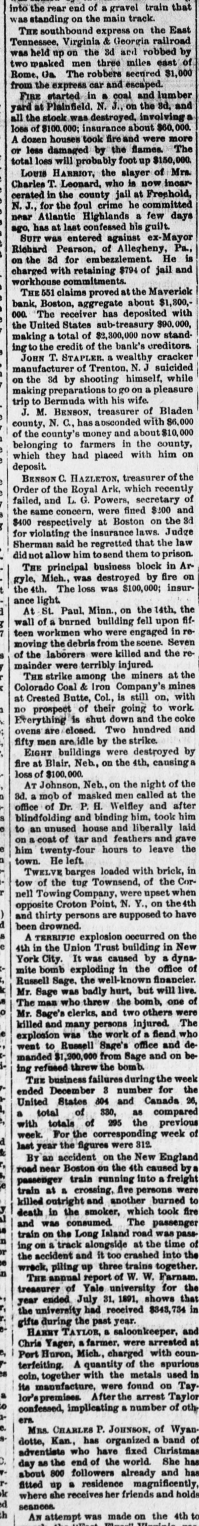 A TERRIFIC explosion occurred on the 4th in the Union Trust building in New York City. It was caused by a dynamite bomb exploding in the office of Russell Sage, the well-known financier. Mr. Sage was badly hurt, but will live. The man who threw the bomb, one of Mr. Sage's clerks, and two others were killed and many persons injured. The explosion was the work of a fiend who went to Russell Sage's office and demanded $1,300,000 from Sage and on being refused threw the bomb.