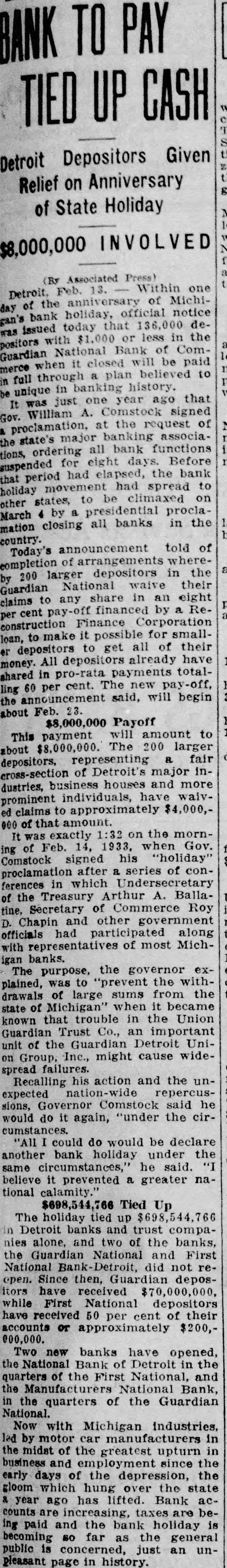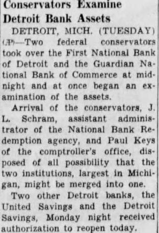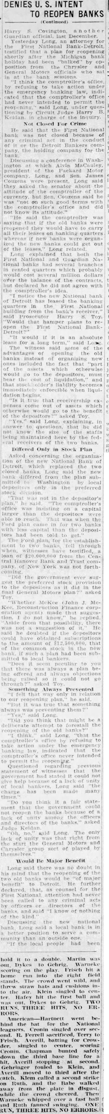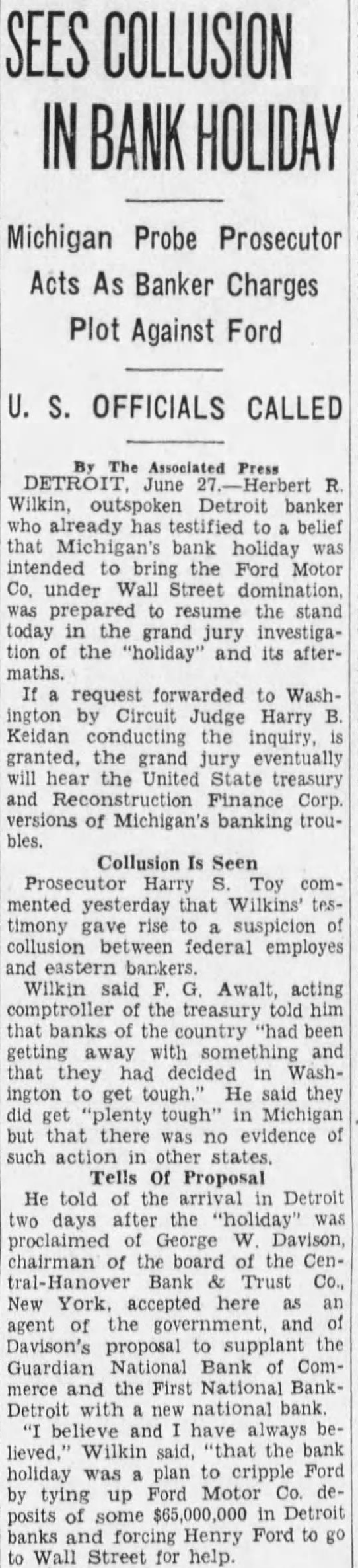 Henry Ford Gives An Interview About Situation Banking Still Insists There Should Be Two Kinds of Banking -In One Depositors Would Ask No Interest and Money Would Not Be Loaned - Second One Would Require Interest and Loans Could Be Made vised me. We are ready to proceed BY JAMES C. AUSTIN provided they can do as they (Copyright 1933 by United Press) agreed. Detroit, Mar 2-Henry Ford enwant to make my position tered the Detroit banking situaclear. I was not keen about going tion because of insistent urging into the banking business. I am of bankers' representatives and bean automobile manufacturer. My cause of a conviction that simpliposition and my ideas regarding fied bankings needed in America banking are well known. But when He felt that he would be able to I was repeatedly asked to create help iron out what he believes these new banks I decided to do are some of the wrinkles in the so. If obstacles develop. if condinational banking fabric. tions change or attitudes are Ford made clear his views on switched, I still retain my posithe Detroit and on the national tion. I stand for a balanced bankbanking situation in an interview ing situation in Detroit. My interwith the United Press. est in seeing that such a position His banking theory is based on a is maintained in Detroit will rebelief that there should be two main unabated regradless of what kinds of banking. may arise tomorrow or later in reIn the first depositors would put gard to my plan to establish two their money in the bank for sernew banks in this city. vice and safe-keeping. They would Commercial Detroit frankly repay a small sum to the bank for garded the situation as one in the service and receive no interest. which the old line eastern bankThe banker would not lend the ing interests, the so-called "Wall money. street banks' are bitterly fighting The second would be for deposito prevent Ford from becoming tors who desired a return on their the dominant banking power of money. Such a bank would lend to the Detroit area. productive enterprises. 'America needs simplified bankHe hoped to put these theories ing' said Ford. During what I into practice in Detroit; a hope he call the crozy age in America when has not abandoned despite the fact all sense of values was distorted that even while he was talking in the scramble to get money by to the United Press representaspeculation and not by work, too tive, authoritative word was gomany banking directorates were ing around that those in control of apparently selected on a country the First National Detroit bank, club basis and vice-presidents on one of two which Ford on Sunday their strength as social assets. agreed to take over, would ask toBanking needs men and has alday to be released from their ways needed men with the keenest agreement. sense of the social responsibilities This word came after Senator of their position. James Couzens, Ford's old business "Banking is not a business in partner, had conferred with bankwhich great financial returns can ers and then for two hours or more come to the bankers. Banking is had talked with Ford. The actua service. The minute a bank is ating cause of the changed plans primarily run to make money it of the First National Detroit group becomes a poor bank just as the was not clear. A strong element in minute that a great surgeon bethe directorate, however, is known comes obsessed with a desire to to from upon the Ford plan. make large sums of money out of Ford, looking much thinner than his proefssion he becomes distinctusual, his tanned face contrasting ly a poor surgeon. with the silver grey of his hair, reiterated that he had not receded "Money, by itself was not the from his original position with recause of depression. Money is not gard to taking over the banks. enough. The depression came because of our state of mind: out of "During the last week representatives of two big Detroit banks the fact that thousands of people came to me not once, but three had come to believe that the way times, and stated that it was imto make money was through possible for them, under the condiplunging on stocks or commodities tions imposed, to reopen the closed instead of producing the goods and banks," he said. creating wealth by work. I "Then after an investigation "I'm not opposed to the sooffered to do what was demanded called Wall street banker or to I and organized two new banks. Wall street. In many ways in my made the offer and it was accepted. judgment their services are reWhen I made it I made my posiquired. They are in a way the scavtion clear and I indicated as exengers of commerce. When a concern gets out of date or ineffiactly as I could the nature and the I character of the banks that cient in its management they go would operate. to these banks for relief and they "They would be banks for the clear them up and get rid of them. people and banks for the assistSome times money is lost in the ance and aid of productive busiprocess but that is generally specness. If there is any desire on the ulators' money. They were ready part of any of the banks involved to take a speculative chance in to withdraw from their acceptance the proposition. The definite benefit is that the field has been cleared of my offer they have not so adup and the commercial debris removed. Sometimes suckers are or replacing old ones. There may caught and by that process gain an be no immediate need for funds for experience that's invaluable to such purposes but the city wishes them later on. to be prepared for emergencies. He "We are going to have to change cited the Platts Mills bridge as an radically our attitude toward monexample. A new bridge was supey and its function in our composed to be built there, but demercial life and toward banks. crease in heavy traffic over the "I believe that there should be structure to and from the Bristol a type of bank that is purely for Company has caused postponesavings in which money is depositment of action. Mayor Hayes also ed w