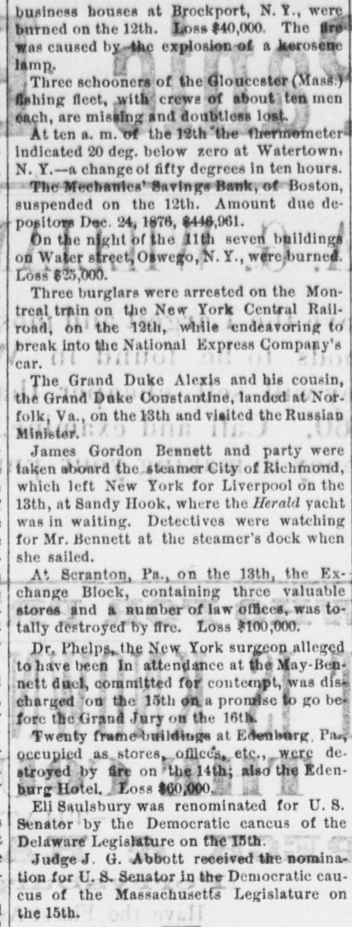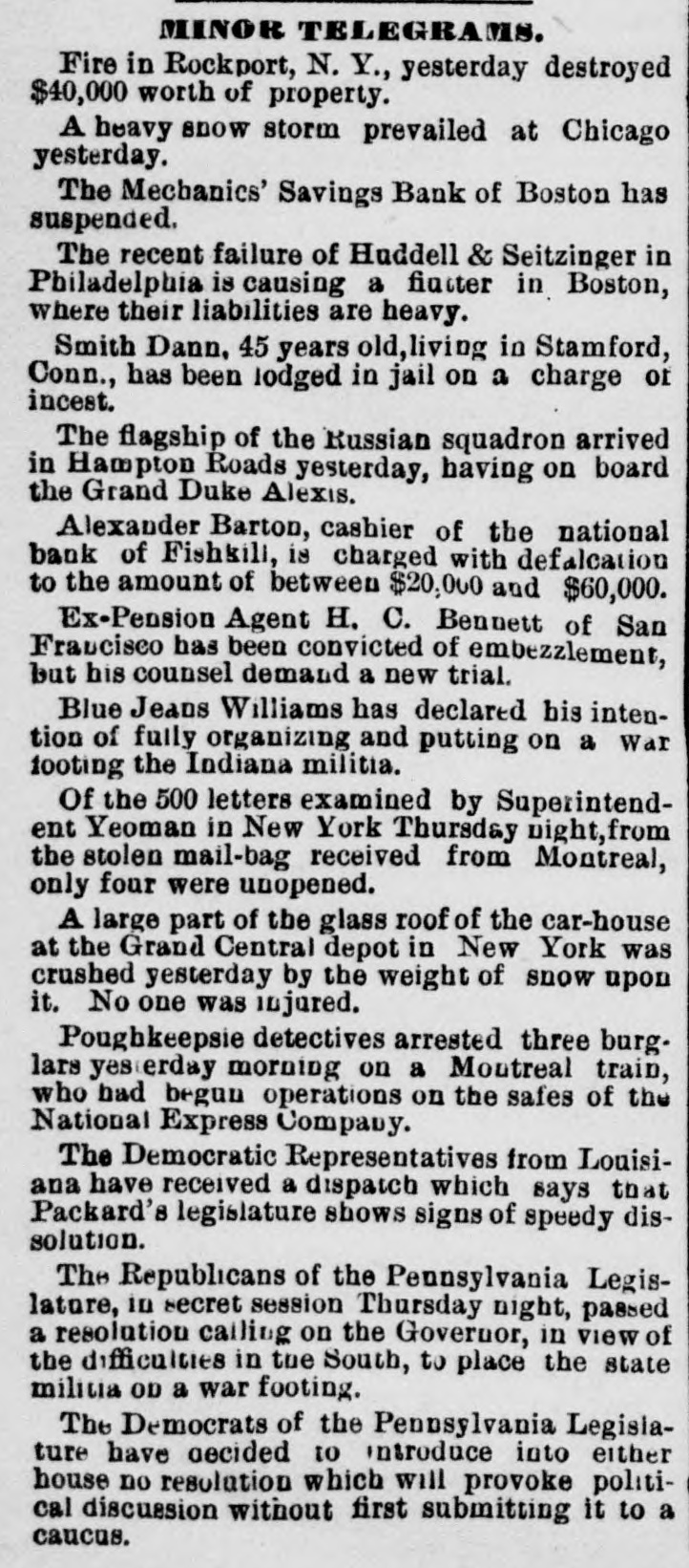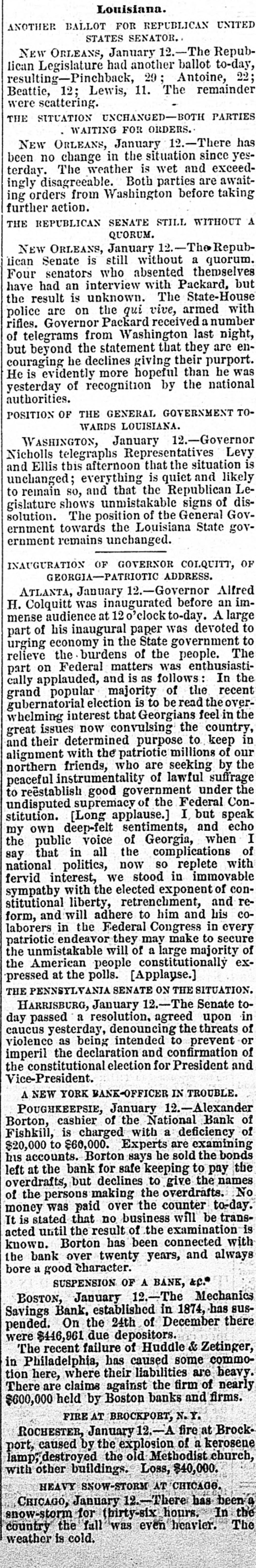 Louisiana. ANOTHER BALLOT FOR REPUBLICAN UNITED STATES SENATOR. NEW ORLEANS, January 12.-The Republican Legislature had another ballot to-day, resulting-Pinchback, 29: Antoine, 22; Beattie, 12 Lewis, 11. The remainder were scattering. THE SITUATION UNCHANGED-BOTH PARTIES WAITING FOR ORDERS. NEW ORLEANS, January 12.-There has been in the yesThe weather is wet exceedterday. no change situation and since ingly are disagreeable. Washington Both parties before taking awaiting orders from further action. THE REPUBLICAN SENATE STILL WITHOUT A QUORUM. NEW ORLEANS, January -The Republican Senate is still without a quorum. Four senators who absented themselves have had an interview with Packard, but the result is unknown. The State-House police are on the qui vive, armed rifles. Governor Packard received a number of telegrams from Washington last night, but beyond the statement that they are encouraging he declines giving their purport. He is evidently more hopeful than he was yesterday of recognition by the national authorities. POSITION OF THE GENERAL GOVERNMENT TOWARDS LOUISIANA. WASHINGTON, January 12.-Governor Nicholls telegraphs Representatives Levy and Ellis this afternoon that the situation is unchanged; everything is quiet and likely to remain so, and that the Republican Legislature shows unmistakable signs of dissolution. The position of the General Government towards the Louisiana State government remains unchanged. INAUGURATION OF GOVERNOR COLQUITT, OF GEORGIA-PATRIOTIC ADDRESS. ATLANTA, January 12.-Governor Alfred H. Colquitt was inaugurated before an immense audience at 12o clock to-day. A large part of his inaugural paper was devoted to urging economy in the State government to relieve the burdens of the people. The Federal matters was enthusiastiand is as majority grand cally part applauded, on popular follows: be of read the the In recent the gubernatorial election is to overwhelming interest that Georgians feel in the issues now convulsing the country, determined purpose with the our and alignment great their patriotic seeking millions to keep of by the in friends, who are instrumentality good to northern peaceful reestablish government of lawful Federal under suffrage Con- the undisputed supremacy of the stitution. [Long applause.] I but speak my own deep-felt sentiments, and echo the public voice of Georgia, when I say that in all the complications of national politics, now so replete with fervid interest, we stood in immovable sympathy with the elected exponent of constitutional liberty, retrenchment, and reform, and will adhere to him and his colaborers in the Federal Congress in every patriotic endeavor they may make to secure the unmistakable will of a large majority of the American people constitutionally expressed at the polls. [Applause.] THE PENNSYLVANIA SENATE ON THE SITUATION. HARRISBURG, January 12.-The Senate today passed a resolution. agreed upon in caucus yesterday, denouncing the threats of violence as being intended to prevent or imperil the declaration and confirmation of the constitutional election for President and Vice-President. A NEW YORK BANK-OFFICER IN TROUBLE. POUGHKEEPSIE, January 12.-Alexander Borton, cashier of the National Bank of Fishkill, is charged with a deficiency of $20,000 to $60,000. Experts are examining his accounts. Borton says he sold the bonds left at the bank for safe keeping to pay the but declines to names of making the overdrafts, the persons counter overdrafts. give the to-day. No money was paid over the It is stated that no business will be transacted until the result of the examination is known. Borton has been connected with the bank over twenty years, and always bore a good character. SUSPENSION OF A BANK, &C. BOSTON, January 12.-The Mechanics Savings Bank. established in 1874, has suspended. On the 24th of December there were $446,961 due depositors. The recent failure of Huddle & Zetinger, in Philadelphia, has caused some commotion here, where their liabilities are heavy. There are claims against the firm of nearly $600,000 held by Boston banks and firms. FIRE AT BROCKPORT, N.Y. ROCHESTER, January 12.- fire at Brockport, caused by the explosion of a kerosene lamp;destroyed the old Methodist church, with other buildings. Loss, $40,000. HEAVY SNOW-STORM AT CHICAGO. CHICAGO, January 12.-There has been a snow-storm for thirty-six hours. In the country the fall was even heavier. The weather is cold.