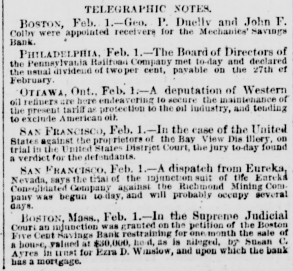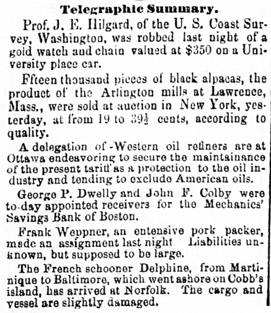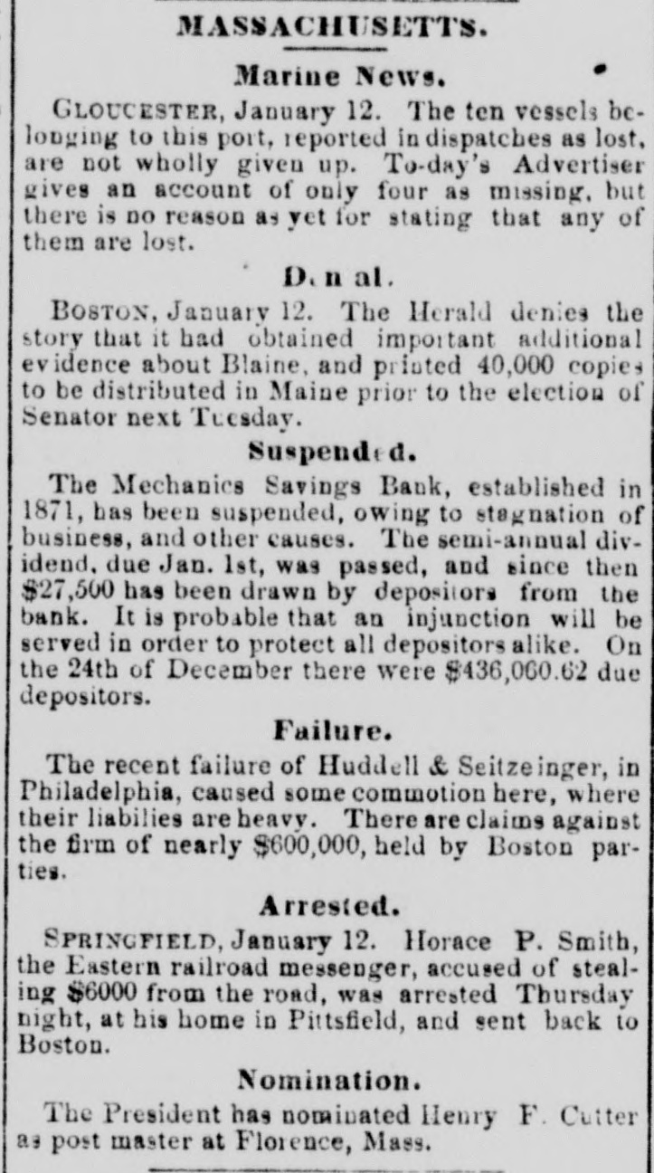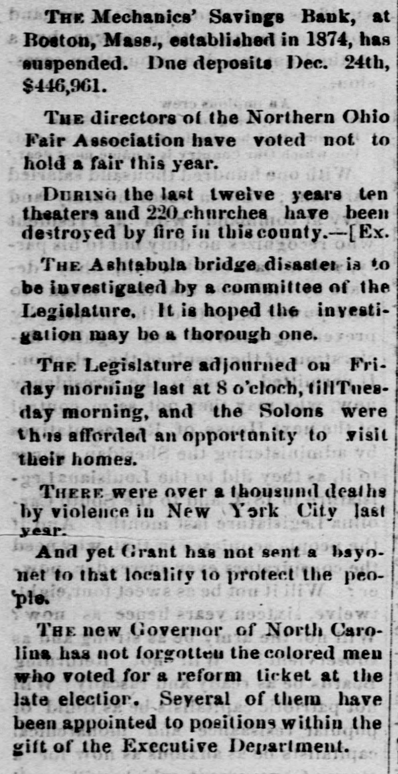 Louisiana. ANOTHER BALLOT FOR REPUBLICAN UNITED STATES SENATOR. NEW ORLEANS, January 12.-The Republican Legislature had another ballot to-day, resulting-Pinchback, 29: Antoine, 22; Beattie, 12 Lewis, 11. The remainder were scattering. THE SITUATION UNCHANGED-BOTH PARTIES WAITING FOR ORDERS. NEW ORLEANS, January 12.-There has been in the yesThe weather is wet exceedterday. no change situation and since ingly are disagreeable. Washington Both parties before taking awaiting orders from further action. THE REPUBLICAN SENATE STILL WITHOUT A QUORUM. NEW ORLEANS, January -The Republican Senate is still without a quorum. Four senators who absented themselves have had an interview with Packard, but the result is unknown. The State-House police are on the qui vive, armed rifles. Governor Packard received a number of telegrams from Washington last night, but beyond the statement that they are encouraging he declines giving their purport. He is evidently more hopeful than he was yesterday of recognition by the national authorities. POSITION OF THE GENERAL GOVERNMENT TOWARDS LOUISIANA. WASHINGTON, January 12.-Governor Nicholls telegraphs Representatives Levy and Ellis this afternoon that the situation is unchanged; everything is quiet and likely to remain so, and that the Republican Legislature shows unmistakable signs of dissolution. The position of the General Government towards the Louisiana State government remains unchanged. INAUGURATION OF GOVERNOR COLQUITT, OF GEORGIA-PATRIOTIC ADDRESS. ATLANTA, January 12.-Governor Alfred H. Colquitt was inaugurated before an immense audience at 12o clock to-day. A large part of his inaugural paper was devoted to urging economy in the State government to relieve the burdens of the people. The Federal matters was enthusiastiand is as majority grand cally part applauded, on popular follows: be of read the the In recent the gubernatorial election is to overwhelming interest that Georgians feel in the issues now convulsing the country, determined purpose with the our and alignment great their patriotic seeking millions to keep of by the in friends, who are instrumentality good to northern peaceful reestablish government of lawful Federal under suffrage Con- the undisputed supremacy of the stitution. [Long applause.] I but speak my own deep-felt sentiments, and echo the public voice of Georgia, when I say that in all the complications of national politics, now so replete with fervid interest, we stood in immovable sympathy with the elected exponent of constitutional liberty, retrenchment, and reform, and will adhere to him and his colaborers in the Federal Congress in every patriotic endeavor they may make to secure the unmistakable will of a large majority of the American people constitutionally expressed at the polls. [Applause.] THE PENNSYLVANIA SENATE ON THE SITUATION. HARRISBURG, January 12.-The Senate today passed a resolution. agreed upon in caucus yesterday, denouncing the threats of violence as being intended to prevent or imperil the declaration and confirmation of the constitutional election for President and Vice-President. A NEW YORK BANK-OFFICER IN TROUBLE. POUGHKEEPSIE, January 12.-Alexander Borton, cashier of the National Bank of Fishkill, is charged with a deficiency of $20,000 to $60,000. Experts are examining his accounts. Borton says he sold the bonds left at the bank for safe keeping to pay the but declines to names of making the overdrafts, the persons counter overdrafts. give the to-day. No money was paid over the It is stated that no business will be transacted until the result of the examination is known. Borton has been connected with the bank over twenty years, and always bore a good character. SUSPENSION OF A BANK, &C. BOSTON, January 12.-The Mechanics Savings Bank. established in 1874, has suspended. On the 24th of December there were $446,961 due depositors. The recent failure of Huddle & Zetinger, in Philadelphia, has caused some commotion here, where their liabilities are heavy. There are claims against the firm of nearly $600,000 held by Boston banks and firms. FIRE AT BROCKPORT, N.Y. ROCHESTER, January 12.- fire at Brockport, caused by the explosion of a kerosene lamp;destroyed the old Methodist church, with other buildings. Loss, $40,000. HEAVY SNOW-STORM AT CHICAGO. CHICAGO, January 12.-There has been a snow-storm for thirty-six hours. In the country the fall was even heavier. The weather is cold.