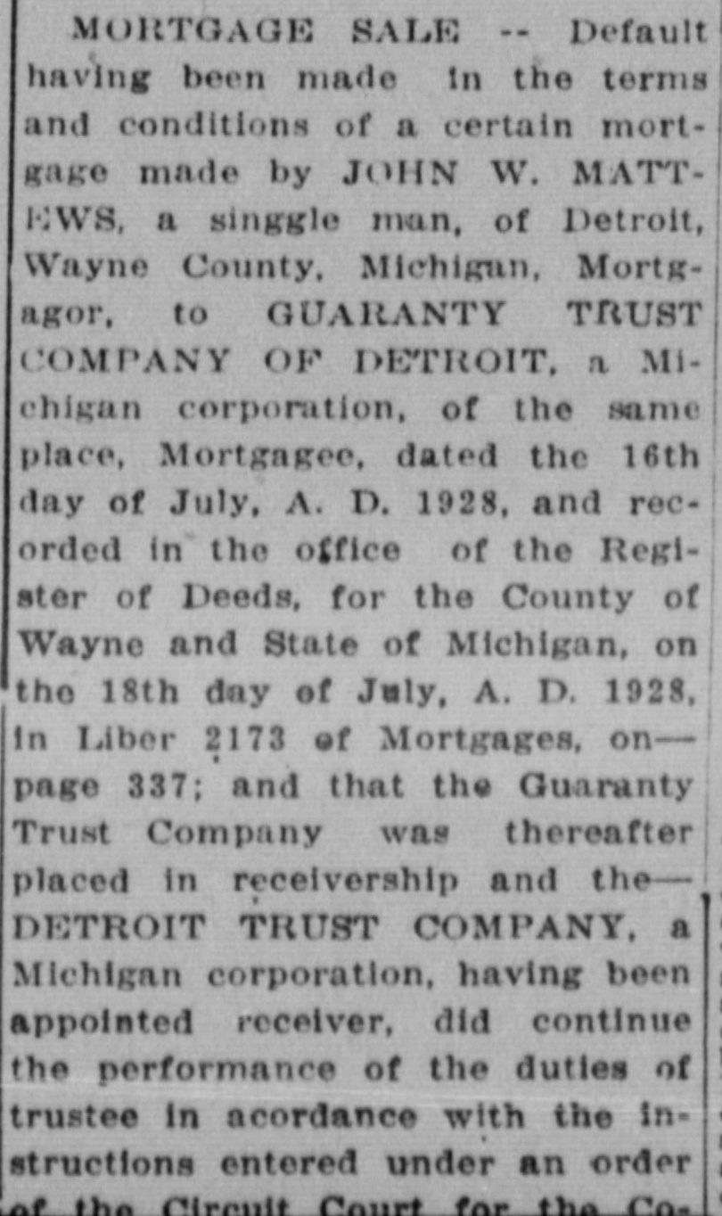 day of July, A. D. 1928, and recorded in the office of the Register of Deeds, for the County of Wayne and State of Michigan, on the 18th day of July, A. D. 1928, in Liber 2173 of Mortgages, on--page 337; and that the Guaranty Trust Company was thereafter placed in receivership and theDETROIT TRUST COMPANY, a Michigan corporation, having been appointed receiver, did continue the performance of the duties of trustee in acordance with the instructions entered under an order of the Circuit Court for the County of Wayne, dated July 30th, 1931; and that thereafter, to-wit, on the 28th day of November, A. D. 1931, the UNION GUARDIAN TRUST COMPANY, a Michigan corporation, of Detroit, Michigan, was appointed successor trustee of said mortgage, by order of the Circuit Court for the County of Wayne, said Order being recorded in the Office of the Register of Deeds for the County of Wayne State of Michigan, in Liber 2621 of Mortgages, page 51; and tha thereafter, on, to-wit, the 16thday of September, A. D. 1933 JAS. SWAN ELDRIDGE was ap pointed successor trustee of said mortgage, by Order of the Circuit Court for the County of Wayne, State of Michigan, and said appointment was accepted by JAS. SWAIN ELDRIDGE in writing on the 16th day of September, A. D. 1933 which said Order and Acceptance were recorded in the Office of the Register of Deeds for the County of Wayne, State of Michigan, on the 19th day of September, A. D. 1933, and recorded in Liber 1675 of Mortgages, pages 627 and 630, respectively: and that there is claimed to be due on said mortgage at the date of this notice, for principal and interest, the sum of TWO THOUSAND SIXTY-NINE and 30c($2,069.30) DOLLARS. No suit or proceedings at law or in equity having been instituted to recover the debt secured by said mortgage or any part thereof. Now, therefore, by virtue of the power of sale contained in said mortgage, and pursuant to the statute of the State of Michigan in such case made and provIded. notice is hereby given that on TUESDAY, the THIRTEENTH day of MARCH. A. D. 1934, at 12:00 o'clock Noon, Eastern Standard Time, said mortgage will be foreclosed by a sale at public auction, to the highest bidder, at the southerly or Congress street entrance to the County Building n the City of Detroit, Wayne Cointy. Michigan, (that being the building where the Circuit Court for the County of Wayne is held) of the premises described in said mortgage, or so much thereof as may be necessary to pay the amount due, as aforsaid, on said mortgage, with the Interest thereon at seven percent (7%) and all legal costs, charges and expenses., including the attorney fees allowed by law, and also any sum or sums which may be paid by the mortgagee, necessary to protect his interest in the premises. Which said premises are described as follows: All that certain piece or parcel of land situato in the City of Detroit, in the County of Wayne and State of Michigan, and described as follows, to-wit: Lot numbered One Hundred Sixty-three (163) HANNAN'S "BELT LINE ADDITION" being part of Private Claim 678, as recorded in ne County, Michigan, Records. Dated at Detroit, Michigan, December 13th, 1933. Jas. Swan Eldridge,' Assignee - Mortgagee. 12-23-1983. Jas. Swan Eldridge,