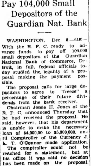 Dec With the R. F. C. ready to advance funds to pay off 104,000 small depositors of the Guardian National Bank of Commerce. De troit, in full. federal officials today studied the legality of proposal making the payment possible. The proposal calls for large depositors to agree to 'freeze' percentage of their future dividends from the bank receiver. Chairman Jessie H. Jones of the R. C. announced Thursday that he had received the proposal He said. however. that his department is unable to make the necessary loan of $4,000.00 to $5,000,000. unAll Comptroller of the Currency T. O'Connor made application The comptroller could not be reached for statement. but at his office It was said no decision has been made on the proposal.