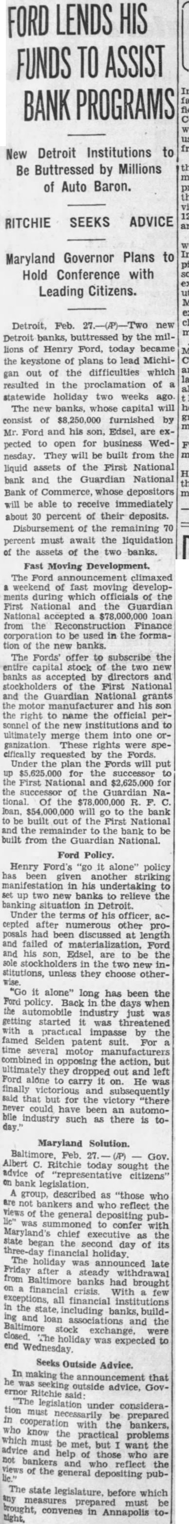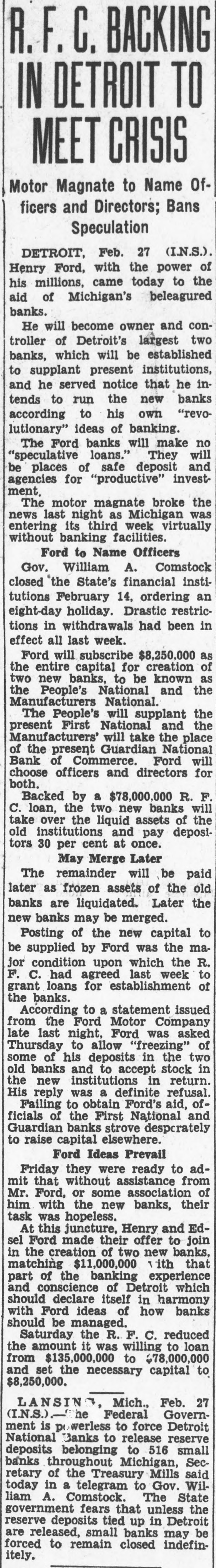 R.F.C. BACKING TO DETROIT MEET CRISIS Motor Magnate to Name Officers and Directors; Bans Speculation DETROIT, Feb. 27 (I.N.S.). Henry Ford, with the power of his millions, came today to the aid of Michigan's beleagured banks. He will become owner and controller of Detroit's largest two banks, which will be established to supplant present institutions, and he served notice that he intends to run the new banks according to his own "revolutionary" ideas of banking. The Ford banks will make no be of safe "speculative places loans." deposit They invest- and will agencies for "productive" ment. The motor magnate broke the news last night as Michigan was entering its third week virtually without banking facilities. Ford to Name Officers Gov. William A. Comstock closed the State's financial institutions February 14, ordering an eight-day holiday. Drastic restrictions in withdrawals had been in effect all last week. Ford will subscribe $8,250,000 as the entire capital for creation of two new banks, to be known as the People's National and the Manufacturers National. The People's will supplant the present First National and the Manufacturers' will take the place of the present Guardian National Bank of Commerce. Ford will choose officers and directors for both. Backed by a $78,000,000 R. F. C. loan, the two new banks will take over the liquid assets of the old institutions and pay depositors 30 per cent at once. May Merge Later The remainder will be paid later as frozen assets of the old banks are liquidated. Later the new banks may be merged. Posting of the new capital to be supplied by Ford was the major condition upon which the R. F. C. had agreed last week to grant loans for establishment of the banks. According to a statement issued from late was Thursday last the night, to Ford allow Motor Ford "freezing" Company asked of some of his deposits in the two old banks and to accept stock in the new institutions in return. His reply was a definite refusal. Failing to obtain Ford's aid, officials of the First National and Guardian banks strove desperately to raise capital elsewhere. Ford Ideas Prevail Friday they were ready to admit that without assistance from Mr. Ford, or some association of him with the new banks, their task was hopeless. At this juncture, Henry and Edsel Ford made their offer to join in the creation of two new banks, matching $11,000,000 ith that part of the banking experience and conscience of Detroit which should declare itself in harmony with Ford ideas of how banks should be managed. Saturday the R. F. C. reduced the amount it was willing to loan from $135,000,000 to 47,000,000 and set the necessary capital to $8,250,000. LANSING Mich., Feb. 27 (I.N.S.). he Federal Government is p werless to force Detroit National Banks to release reserve deposits belonging to 516 small banks throughout Michigan, Secretary of the Treasury Mills said today in a telegram to Gov. William A. Comstock. The State government fears that unless the reserve deposits tied up in Detroit are released, small banks may be forced to remain closed indefinitely.