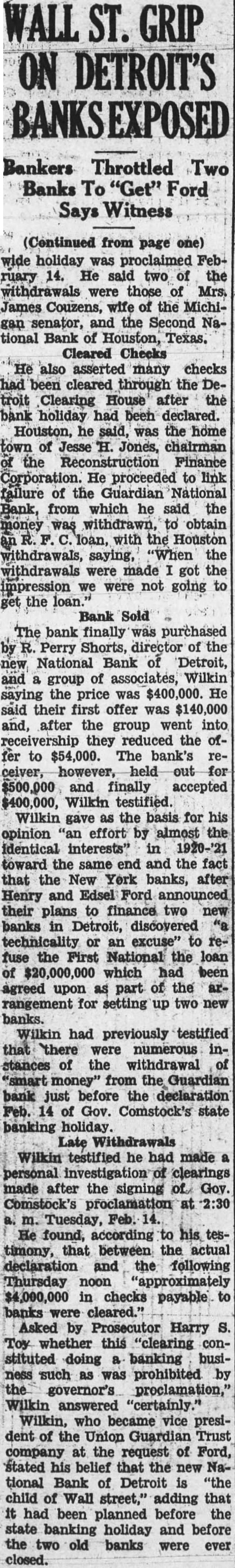 Bank Sold The bank finally was purchased by R. Perry Shorts, director of the new National Bank of Detroit, and a group of associates, Wilkin saying the price was $400,000. He said their first offer was $140,000 and, after the group went into receivership they reduced the offer to $54,000. The bank's receiver, however, held out for $500,000 and finally accepted $400,000, Wilkin testified. Wilkin gave as the basis for his opinion "an effort by almost the identical interests" in 1920-'21 toward the same end and the fact that the New York banks, after Henry and Edsel Ford announced their plans to finance two new banks in Detroit, discovered "a technicality or an excuse" to refuse the First National the loan of $20,000,000 which had been agreed upon as part of the arrangement for setting up two new banks. Wilkin had previously testified that there were numerous instances of the withdrawal of "smart money" from the Guardian bank just before the declaration Feb. 14 of Gov. Comstock's state banking holiday. Late Withdrawals Wilkin testified he had made a personal investigation of clearings made after the signing of Gov. Comstock's proclamation at 2:30 a. m. Tuesday, Feb. 14. He found, according to his testimony, that between the actual declaration and the following Thursday noon "approximately $4,000,000 in checks payable to banks were cleared." Asked by Prosecutor Harry S. Toy whether this "clearing constituted doing a banking business such as was prohibited by the governor's proclamation," Wilkin answered "certainly." Wilkin, who became vice president of the Union Guardian Trust company at the request of Ford, stated his belief that the new National Bank of Detroit is "the child of Wall street," adding that it had been planned before the state banking holiday and before the two old banks were ever closed.