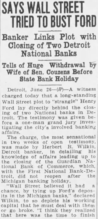 Detroit, June 26-(P)-A witness charged today that Wall Street plot to "strangle" Henry Ford lay directly behind the ing National banks in Detroit. The testimony was before grand investigating the involved banking affairs. The charge. the most sensational in weeks open testimony made by Herbert Detroit banker, detailing his of leading the closing Guardian tional Bank with the First National troit, reopen after Michigan banking holiday. "Wall Street believed had tying Ford's deposits declared Wilkin, deplete his working capital that must them broke think they realized that here was the time to finish