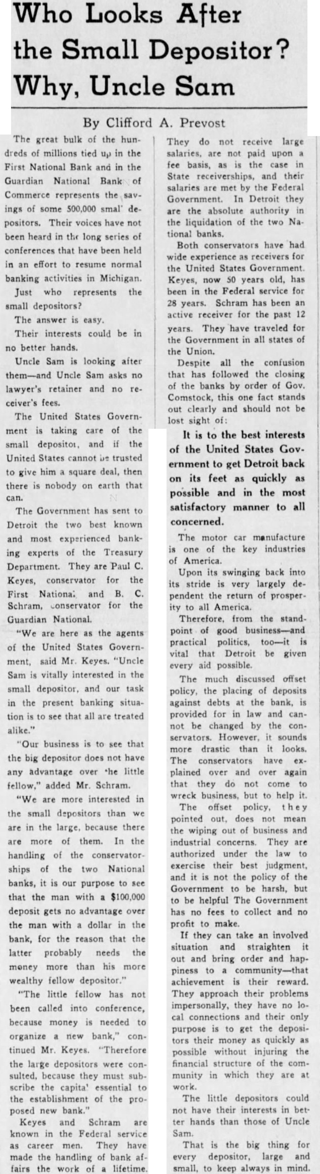 The Government has sent to Detroit the two best known and most experienced banking experts of the Treasury Department. They are Paul C. Keyes, conservator for the First National and B. C. Schram, Conservator for the Guardian National. "We are here as the agents of the United States Government, said Mr. Keyes. "Uncle Sam is vitally interested in the small depositor, and our task in the present banking situation to see that all are treated alike."