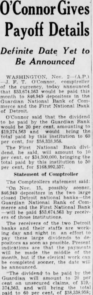 Announcement that 136,000 depositors with $1,000 or less in the Guardian National Bank of Commerce when it closed will be paid in full through plan ... payment will begin February 23 (1934).