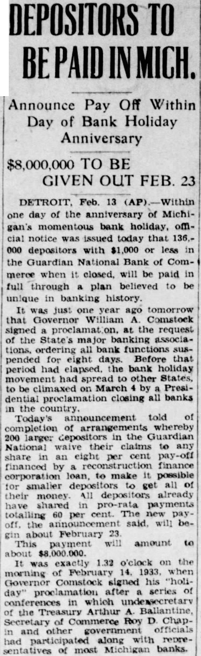 DETROIT Feb. 13 one day of the anniversary of Michigan's momentous bank holiday, official notice issued today that 136,000 depositors with $1,000 or less in the Guardian National Bank of Commerce when it closed. will be paid in full through plan believed to be unique in banking history. was just year ago tomorrow that Comstock signed at the request of the State's banking associations, all bank functions pended for eight days. Before that period had elapsed. bank holiday spread other States, be on March Presidential proclamation closing all banks in Today's announcement told of completion of arrangements whereby 200 larger depositors in the Guardian National waive their claims to share an eight cent pay-off financed finance corporation loan, make possible for smaller get all their money All depositors already shared pro-rata payments totalling per cent. The payoff. announcement will bethe about February 23. gin This payment will amount to about It exactly 1.32 o'clock on the morning February 1933, when Governor Comstock signed his "holiday" proclamation after series of conferences in which of the Arthur Ballantine, Secretary of Commerce Roy D. Chapother government officials had participated along with representatives of most Michigan banks.