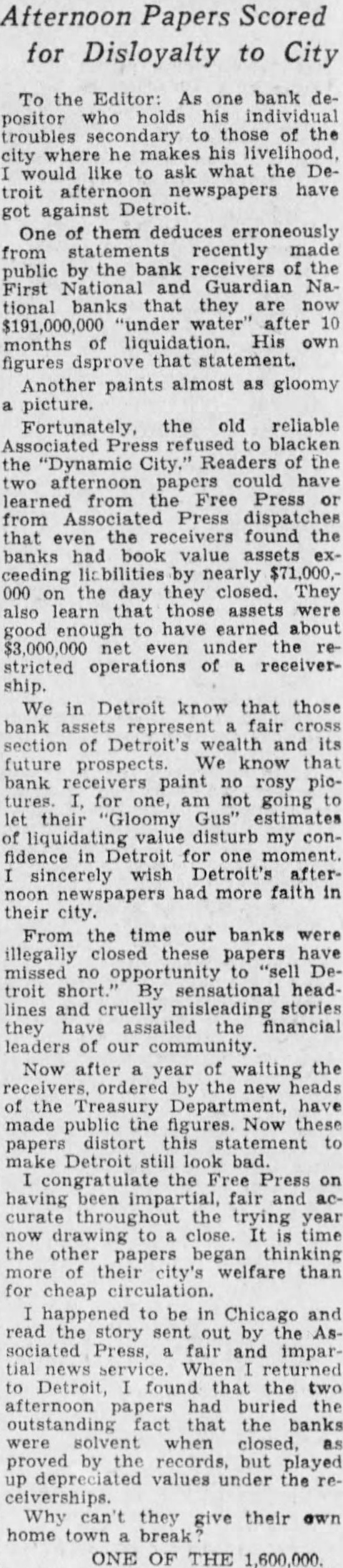 To the Editor: one bank positor holds individual troubles secondary the he makes his have against One them deduces erroneously recently the bank receivers First National and Guardian Na. that they "under after months liquidation. own figures dsprove that statement. Another paints almost gloomy picture. Fortunately, the old reliable the "Dynamic City." Readers the afternoon papers could learned from the Free Press from Press dispatches even found the ceeding the closed. They learn those assets enough earned about under stricted receiverWe Detroit know that those bank fair cross section Detroit's wealth and its future prospects know bank rosy picnot going their my fidence for wish newspapers had more faith in their From the time our banks illegally these papers missed opportunity troit headand cruelly misleading stories assailed financial leaders community Now after year of waiting the ordered the heads the Treasury Department, have made public figures. Now papers Detroit fair and curate the trying other papers began thinking city's welfare than for cheap circulation. happened to Chicago and the story out sociated and impartial When returned Detroit, the afternoon buried that the banks when proved by the records, but played values under Why they their own home town ONE OF THE