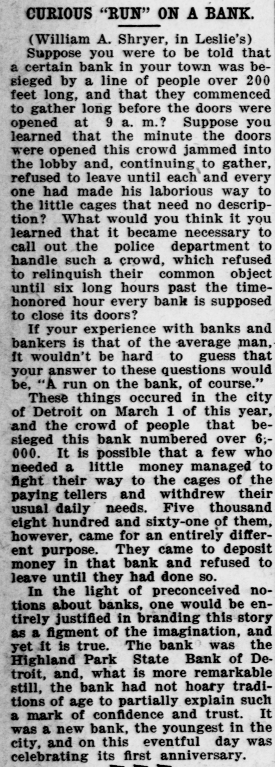 CURIOUS "RUN" ON A BANK William A. Shryer, in Leslie's. Supposing you were to be told that a certain bank in your town was besieged by a line of people over 200 feet long, and that they commenced to gather long before the doors were opened at 9 a. m.? Suppose you learned that, the minute the doors were opened, this crowd jammed into the lobby and, continuing to gather, refused to leave until each any every one had made his laborious way to the little cages that need no description? What would you think if you learned that it became necessary to call out the police department to handle such a crowd, which refused to relinquish their common object until six long hours past the time-honored hour every bank is supposed to close its doors? If your experience with banks and bankers is that of the average man, it would not be hard to guess that your answer to these questions would be: "A run on the bank, of course!" These things occurred in the city of Detroit on March 1 of this year, and the crowd of people that besieged this bank numbered over 6000. It is possible that a few who needed a little money managed to fight their way to the cages of the paying tellers and withdrew their usual daily needs. Five thousand eight hundred and sixty-one of them, however, came for an entirely different purpose. They came to deposit money in that bank and refused to leave until they had done so. In the light of preconceived notions about banks one would be entirely justified in branding this story as a figment of the imagination, and yet it is true. The bank was the Highland Park bank of Detroit, and what is more remarkable still, the bank had no hoary traditions of age to partially explain such a mark of confidence and trust. It was a new bank, the youngest in the city, and on this eventful day was celebrating its first anniversary. For the past 15 years a number of men, whose energy in the face of discouragement is amazing, have been trying to make the banks see that it pays to advertise. As a result, there are a number of banks which actually spend real money in advertising. Many, however, continue to look upon the double-column, five-inch display of the financial statement of the bank as advertising. Not so the Highland Park bank. Its officers and directors believe in putting the human touch into business and the above result was due to a regular human interest newspaper campaign.