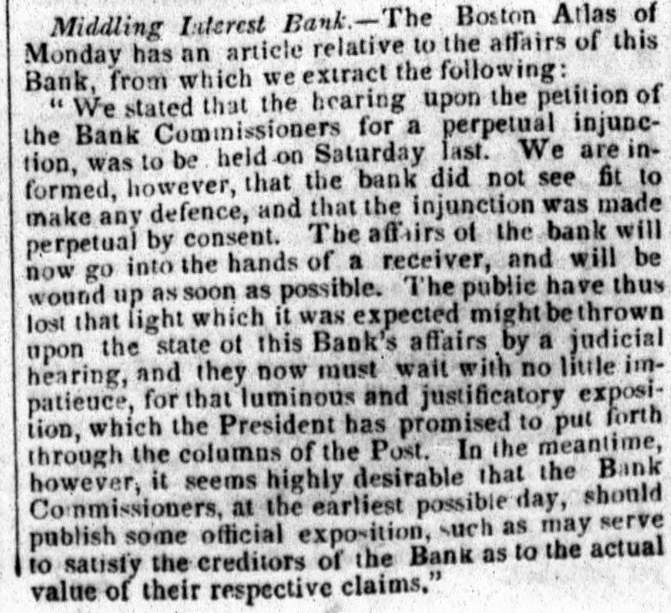 Middling Interest Bank -The Boston Atlas of Monday has an article relative to the affairs of this Bank, from which we extract the following: "We stated that the hearing upon the petition of the Bank Commissioners for a perpetual injunc- tion, was to be held on Saturday last. We are in- formed, however, that the bank did not see fit to make any defence, and that the injunction was made perpetual by consent. The affairs of the bank will now go into the hands of a receiver, and will be wound up as soon as possible. The public have thus lost that light which it was expected might be thrown upon the state of this Bank's affairs by a judicial hearing, and they now must wait with no little im- patience, for that luminous and justificatory exposi- tion, which the President has promised to put forth through the columns of the Post. In the meantime, however, it seems highly desirable that the Bank Commissioners, at the earliest possible day, should publish some official exposition, such as may serve to satisfy the creditors of the Bank as to the actual value of their respective claims."