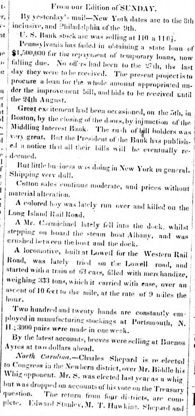 From our Edition of SUNDAY. By yesterday's mail-New York dates are to the 8th inclusive, and Philadelphia of the 9th. ht U.S. Bank stock are was selling at 110 a 1103. Pennsy Ivania has failed in obtaining a state loan of 1,500,000 for the repayment of temporary loans, now falling due. No offers had been to the 27th, the last day they were to be received. The present project is to procure a loan for the whole amount appropriated under the improvement bill, and bids to be received until the 24th August. Greut excitement had been occasioned, on the 5th, in Boston, by the closing of the doors, by injunction of the Middling Interest Bank. The rush of bill holders was very great. But the President of the Bank has published a notice that all their bills will be eventually redeemed. But little business was doing in New York in general. Shipping very dull. Cotton sales continue moderate, and prices without material alteration. A colored boy was lately run over and killed on the Long Island Rail Road, A Mr. Carmichael lately fell into the dock. whilst stepping on board the steam boat Albany, and was crushed between the bont and the dock. A locomotive, built at Loweil for the Western Rail Road, was lately tried on the Lowell road, and started with a train of 63 cars, filled with merchandize, weighing 333 tons, which it carried with ease, over an ascent of 10 feet to the mile, at the rate of 9 miles the hour. Two hundred and twenty hands are constantly employed in manufacturing stockings at Portsmouth, N. H.; 3000 pairs were made in one week. By the latest accounts, beeves were selling at Buenos Ayres at two dollars ahead. North Carolina.-Churles Shepard is re elected to Congress in the Newbern district, over Mr. Biddle his Whig opponent. Mr. S. was elected last year as a whig but was dropped on accounts of his vote on the Treasury question. The return from four di-tricts, are complete. Edward Stanley, M. T. Hawkins. Shepard and