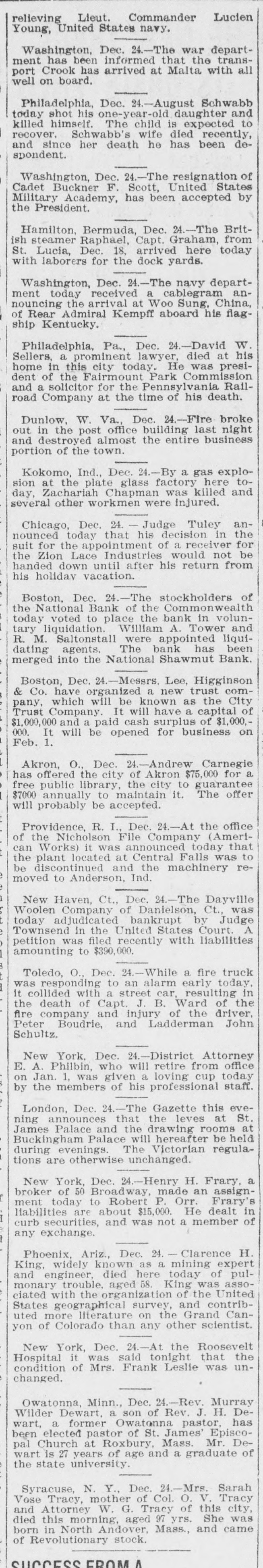 relieving Lieut. Commander Lucien Young, United States navy. Washington, Dec. 24.-The war department has been informed that the transport Crook has arrived at Malta with all well on board. Philadelphia, Dec. 24.-August Schwabb today shot his one-year-old daughter and killed himself. The child is expected to recover. Schwabb's wife died recently, and since her death he has been despondent. Washington, Dec. 24.-The resignation of Cadet Buckner F. Scott, United States Military Academy, has been accepted by the President. Hamilton, Bermuda, Dec. 24.-The British steamer Raphael, Capt. Graham, from St. Lucia, Dec. 18, arrived here today with laborers for the dock yards. Washington, Dec. 24.-The navy department today received a cablegram announcing the arrival at Woo Sung, China, of Rear Admiral Kempff aboard his flagship Kentucky. Philadelphia, Pa., Dec. 24.-David W. Sellers, a prominent lawyer, died at his home in this city today. He was president of the Fairmount Park Commission and a solicitor for the Pennsylvania Railroad Company at the time of his death. Dunlow, W. Va., Dec. 24.-Fire broke out in the post office building last night and destroyed almost the entire business portion of the town. Kokomo, Ind., Dec. 24.-By a gas explosion at the plate glass factory here today, Zachariah Chapman was killed and several other workmen were injured. Chicago, Dec. 24. - Judge Tuley announced today that his decision in the suit for the appointment of a receiver for the Zion Lace Industries would not be handed down until after his return from his holiday vacation. Boston, Dec. 24.-The stockholders of the National Bank of the Commonwealth today voted to place the bank in voluntary liquidation. William A. Tower and R. M. Saltonstall were appointed liquidating agents. The bank has been merged into the National Shawmut Bank. Boston, Dec. 24.-Messrs. Lee, Higginson & Co. have organized a new trust company, which will be known as the City Trust Company. It will have a capital of $1,000,000 and a paid cash surplus of $1,000,000. It will be opened for business on Feb. 1. Akron, O., Dec. 24.-Andrew Carnegie has offered the city of Akron $75,000 for a free public library, the city to guarantee $7000 annually to maintain it. The offer will probably be accepted. Providence. R. I., Dec. 24.-At the office of the Nicholson File Company (American Works) it was announced today that the plant located at Central Falls was to be discontinued and the machinery removed to Anderson, Ind. New Haven, Ct., Dec. 24.-The Dayville Woolen Company of Danielson, Ct., was today adjudicated bankrupt by Judge Townsend in the United States Court. A petition was filed recently with liabilities amounting to $390,000. Toledo, O., Dec. 24.-While a fire truck was responding to an alarm early today, it collided with a street car. resulting in the death of Capt. J. B. Ward of the fire company and injury of the driver, Peter Boudrie, and Ladderman John Schultz. New York, Dec. 24.-District Attorney E. A. Philbin, who will retire from office on Jan. 1, was given a loving cup today by the members of his professional staff. London, Dec. 24.-The Gazette this evening announces that the leves at St. James Palace and the drawing rooms at Buckingham Palace will hereafter be held during evenings. The Victorian regulations are otherwise unchanged. New York, Dec. 24.-Henry H. Frary, a broker of 50 Broadway, made an assignment today to Robert P. Orr. Frary's liabilities are about $15,000. He dealt in curb securities, and was not a member of any exchange. Phoenix, Ariz., Dec. 24. Clarence H. King, widely known as a mining expert and engineer, died here today of pulmonary trouble, aged 58. King was assoclated with the organization of the United States geographical survey, and contributed more literature on the Grand Canyon of Colorado than any other scientist. New York, Dec. 24.-At the Roosevelt Hospital it was said tonight that the condition of Mrs. Frank Leslie was unchanged. Owatonna, Minn., Dec. 24.-Rev. Murray Wilder Dewart, a son of Rev. J. H. Dewart, a former Owatonna pastor, has been elected pastor of St. James' Episcopal Church at Roxbury, Mass. Mr. Dewart is 27 years of age and a graduate of the state university. Syracuse, N. Y., Dec. 24.-Mrs. Sarah Vose Tracy, mother of Col. O. V. Tracy and Attorney W. G. Tracy of this city, died this morning, aged 97 yrs. She was born in North Andover, Mass., and came