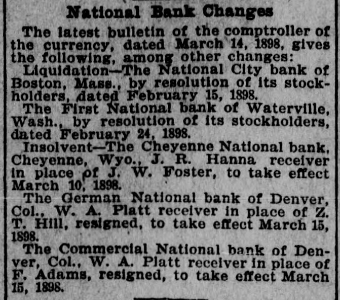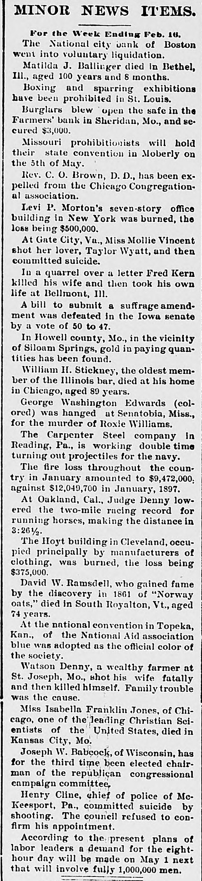 MINOR NEWS ITEMS. For the Week Ending Feb. 16. The National city bank of Boston went into voluntary liquidation. Matilda J. Ballinger died in Bethel, Ill., aged 100 years and 8 months. Boxing and sparring exhibitions have been prohibited in St. Louis. Burglars blew open the safe in the Farmers' bank in Sheridan, Mo., and secured $3,000. Missouri prohibitionists will hold their state convention in Moberly on the 5th of May. Rev. C. O. Brown, D. D., has been expelled from the Chicago Congregational association. Levi P. Morton's seven-story office building in New York was burned, the loss being $500,000. At Gate City, Va., Miss Mollie Vincent shot her lover, Taylor Wyatt, and then committed suicide. In a quarrel over a letter Fred Kern killed his wife and then took his own life at Bellmont, Ill. A bill to submit a suffrage amendment was defeated in the Iowa senate by a vote of 50 to 47. In Howell county, Mo., in the vicinity of Siloam Springs, gold in paying quantities has been found. William H. Stickney, the oldest member of the Illinois bar, died at his home in Chicago, aged 89 years. George Washington Edwards (colored) was hanged at Senatobia, Miss., for the murder of Roxie Williams. The Carpenter Steel company in Reading, Pa., is working double time turning out projectiles for the navy. The fire loss throughout the country in January amounted to $9,472,000. against $12,049,700 in January, 1897. At Oakland, Cal., Judge Denny lowered the two-mile racing record for running horses, making the distance in 3:261/2. The Hoyt building in Cleveland, occupied principally by manufacturers of clothing, was burned, the loss being $375,000. David W. Ramsdell, who gained fame by the discovery in 1861 of "Norway oats," died in South Royalton, Vt., aged 74 years. At the national convention in Topeka, Kan., of the National Aid association blue was adopted as the official color of the society. Watson Denny, a wealthy farmer at St. Joseph, Mo., shot his wife fatally and then killed himself. Family trouble was the cause. Miss Isabella Franklin Jones, of Chicago, one of the leading Christian Scientists of the United States, died in Kansas City, Mo. Joseph W. Babcock, of Wisconsin, has for the third time been elected chairman of the republican congressional campaign committee, Henry Cline, chief of police of McKeesport, Pa., committed suicide by shooting. The council refused to confirm his appointment. According to the present plans of labor leaders a demand for the eighthour day will be made on May 1 next that will involve fully 1,000,000 men.