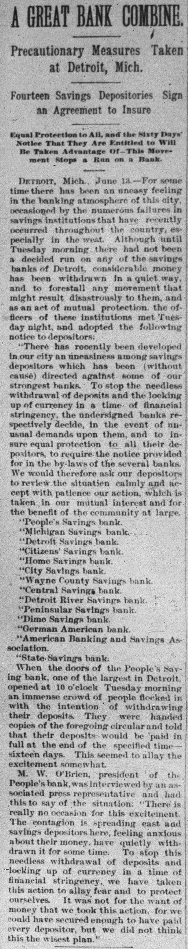 DETROIT BANES REQUIRE NOTICE. Savings Cannot be Withdrawn Except Under the Ninety Days Notice-A Run Started and Checked. DETROIT, MICH., Jnne 13.--For some time there has been an uneasy feeling in the banking atmosphere of his city, occasioned the numerous that have the country, espeoccurred saving institutions throughout by failures recently there cially had Although in the been until West. this morning not a decided run on of the banks considersavings has been of Detroit, any able money withdrawn in a to movement to quiet that way, might and result forestall disastrously any them and as an act of mutual protection, the officers of those institutions met last night and adopted the following notice to depositors: "There has recently been developed in our city an uneasiness among saving depositors which has been (without cause) directed against some of our strongest banks. To stop the heedless withdrawal of deposits and the lecking up of currency in a time of financial stringency, the undersigned banks respectfully decide in the event of unusual demands OH them and to ensure equal protection to all their depositors, to require the notice provided fori the by-laws of the several banks. "We would, therefore, ask our depositors to review the situation calmly and accept with patience our action, which is taken in our mutual interest and for the benefit of the country at large. "PEOPLE'S SANINGS BANK, "MICHIGAN SAVINGS BANK, "DETROIT SAVINGS BANK, "CITIZENS' SAVINGS BANK, "HOME SAVINGS BANK, "CITY SAVINGS BANK, "WAYNE COUNTY SAVINGS BANK, "CENTRAL SAVINGS BANK, "DETROIT RIVER SAVINGS BANK, "PENINSULAR SAVINGS BANK, "DIME SAVINGS BANK, "GERMAN-AMERICAN BANK, "AMERICAN BANKING AND SAVINGS AssociTION, "STATE SAVINGS BANK." doors of the SavWhen Bank, the largest Peoples in ings one of the Detroit, opened at 10 o'clock this morning an immense crowd of people flocked in with the intention of their were handed of depossts. foregoing They withdrawing told copies the circular and that their deposits would be paid in full at the end of the specified time-90 days. This seemed to allay the excitement somewhat. M. W. O'Brien, president of the Peoples was interviewed the Associated and had this to Bank Press by say: really no this The is excitement. "There and is the contagion occasion for spreading to stop needless withdrawal of and of currency in a we deposits time taken of financial looking stringency up have this action to allay fear." At the people's Bank things began to quiet no down when for it was seen there was of men to toward the had business occasion much de making alarm. quelling heavy A long deposits line citement and everything is comparatively quiet at the other banks. Deposits in the People's Saving Bank amount to over $6,000,000. State Banking Commissioner Sher. wood pronounces it and the other savings bank in the city in a first class condition and says there is no occasion for alarm. OMAHA, NEB., June 13.-The American National Bank was closed by order of the comptroller of currency this morning. Runs started on the Globe Loan & Trust Co., the Dime Savings Bank, the German Savings Bank and Nebraska Savings Bank. No statement of the condition of of the American National is made at once except the fact that the clearing house refused to assist it. It is understood that the affairs of the bank are entangled with those of the McCague Savings Bank that closed yesterday afternoon. The run was of extensive proportions en the Omaha Savings Bank and all the morning the bank was besieged by depositors. Senator Manderson and Vice President Kimball of the Union Pacific, directors of the bank, made speeches to the excited depositors guaranteeing them their money, but the run continued. COLUMBUS, O., June 13.-The Franklin Buggy Company has been put in the hands of a receiver. It is the smallest and youngest company in this business in Columbus. Liabilities are stated to be about $75,000. Assets will hardly cover that sum. The concern was not making money, and the receivership is said to be intended to wind up a losing business on account of the tightening of the times. CLEVELAND, O., June 13.-At the instance of the National Bank of Commerce, W. M. Reynolds was to-day appointed receiver of the Williams Publishing Company, a company doing a large printing and publishing business. The assets and liabilities are not known. NEW YORK, June 13.-Defalcations ag gregating $70,600 have been discovered in the Irving Savings Institution, 96 Warren street, New York. The shortage was discovered by the State Bank Examiners, who are still at work on the books and will not complete their work of the accounts some as there are accounts to 17,000 bank's individual for time, scrutinizing investigate besides the regular bank books.