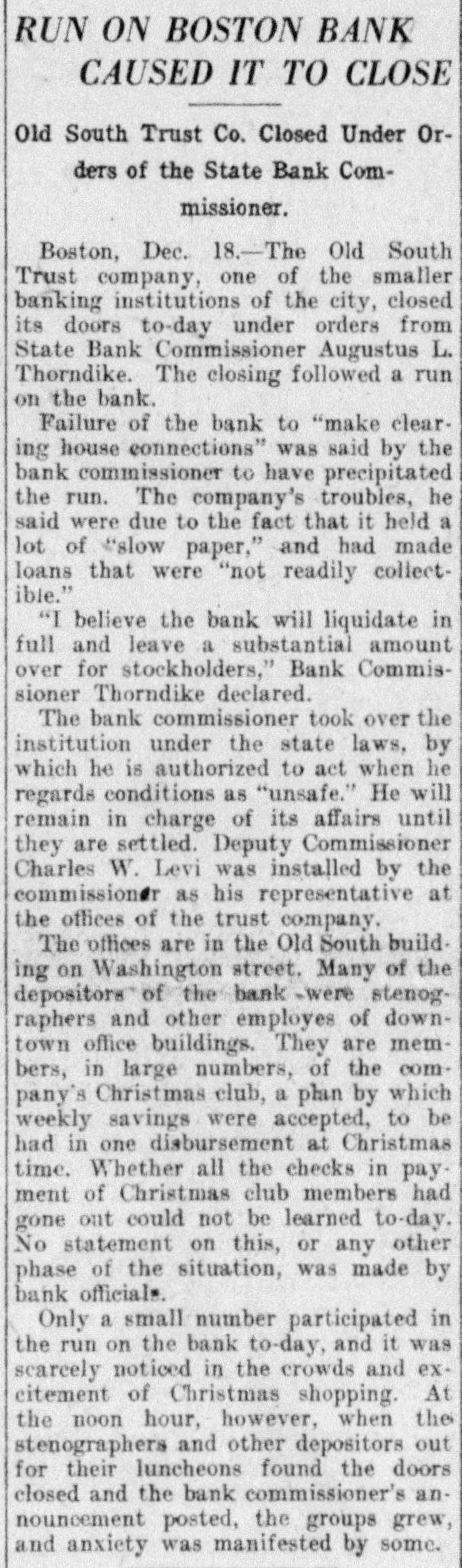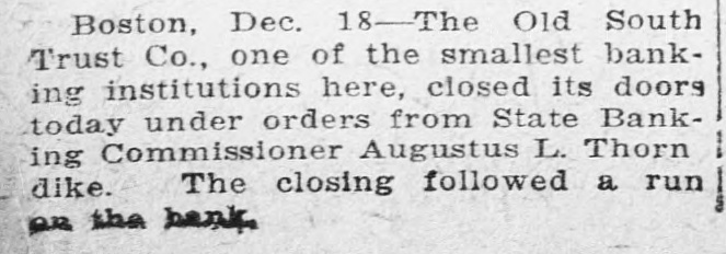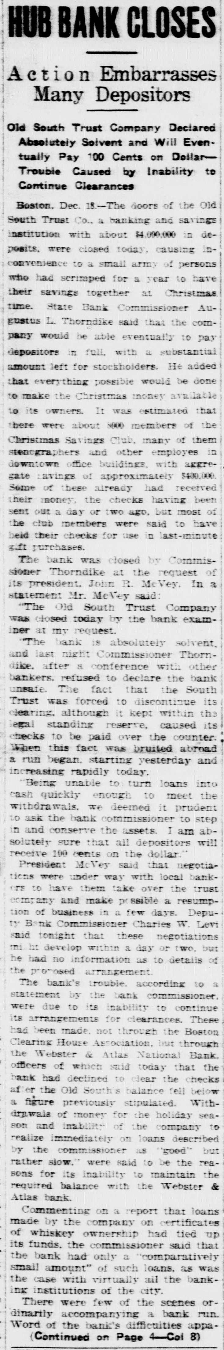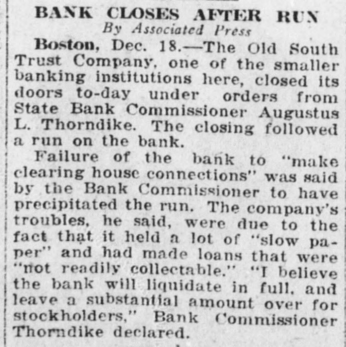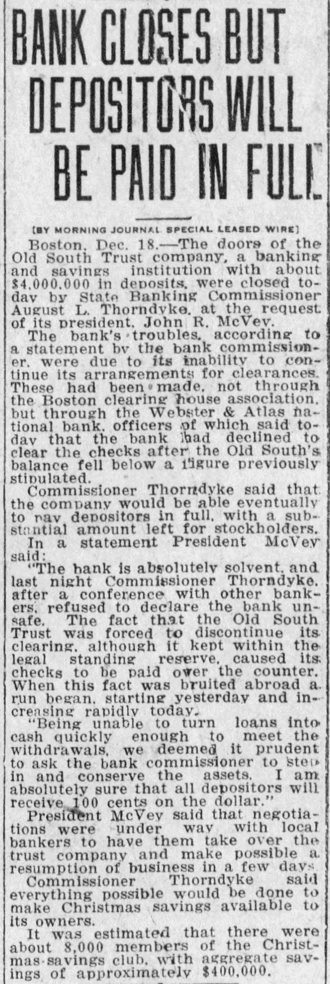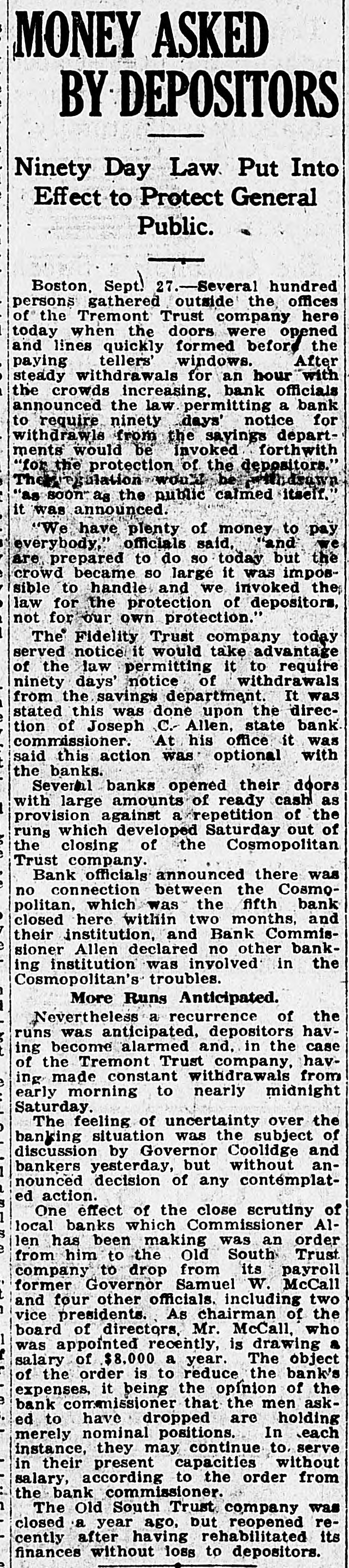 TREMONT TRUST CO., DORCHESTER TRUST FIDELITY TRUST CO. Bank Commissioner Allen Advised Resort to the Law Which Requires 90Day Notice Before Withdrawal of Funds-All Them Are Believed to Be Able to Meet Calls. Boston, Sept. 27 Public unrest over conditions to-day caused a some institutions rerun banking on Trust with the sult that the Tremont company the Fidelity Trust company and the Dorchester Trust company invoked the law which makes it possible to require ninety days notice of withdrawals from the savings departments, in or der to stop the rush of frightened de positors. the Tremont Trust com was in by pany The run participated on crowd hundreds bethe of the so that were called upon to and and came afoot, proportions great police, mounted keep in order! The bank sought for hour to meet the officials announced was the it. and an crowd claims all, there but against the money on hand to pay Vice crush became so great that President Simon Swig announced that the ninety-day notice would be required. At the Fidelity Trust company, which also has offices in the downtown district, the run was in smaller volume, but the law was called upon, to it was stated. "to allow the public recover from the prevailing unrest. There has been a run on the Dorches ter Trust company for several days; and the invocation of the law there stopped the payments. Officials of the institutions in several instances announced by statement or advertisement that there was no connection between the Cosmopolitan, which was the fifth bank to be closed here within two months, and their in stitutions, and Bank Commissioner Joseph C. Allen declared that no other banking institution was involved in the Coemopolitan's troubles. Nevertheless, a recurrence of the runs was an ticipated in some degree. depositors having become alarmed and, in the case of the Tremont Trust company, having made constant hdrawals from morning Saturday almost to midnight, the management having ex a tended the closing hour from noon to accommodate them. The feeling of uncertainty over the banking situation was the subject of discussion by Governor Coolidge and bankers yesterday, but without an nouncement of any contemplated ac tion. One effect of the close scrutiny of the affairs of local banks, which Commissioner Allen has been making, was an order from him to the management of the Old South Trust company to drop M from its payroll former Governor Sam uel W. McCall and four other officials, As M including two ce-presidents chairman of the board of directors of the company, McCall, who was ap pointed recently, is drawing a salary el of $8,000 a year, and the other men involved are said to be receiving sev earal thousand dollars each. a The object of the order is to reduce f the bank's expenses. and it is the opinion of the bank commissioner that D the men whom he asked to have dropped are holding merely nominal positions for which the salaries might to well be saved. In each instance, they may continue to serve in their present capacities without salary, according to the order from the bank commissioner to the Old South management. The Old South Trust company was M closed a year ago and re-opened re to cently after having rehabilitated its finances without loss to the depositors of Several hundred persons had gath ered outside the offices of the Tremont W Trust company when the doors were th opened at 8:45. fifteen minutes before as the usual hour and lines quickly formed tl before the several paying tellers' win dows. After withdrawals had been going on steadily for nearly an hour & with the crowds constantly increasing be the bank officials announced that the m law permitting a bank to require 90 days' notice for withdrawals from the savings department would be invoked forthwith "for the protection of the m depositors. The regulation would be m withdrawn "as soon as the public th calmed itself. it was announced M We have plenty of money to pay everybody. officials said. "and we're prepared to do so this morning, but at he crowd became so large that it was el impossible to handle them and we in is roked the law for the protection of the he depositors, not for our own protec iden. The Fidelity Trust company also served notice on depositors that it f would take advantage of the 90 days ke law. It was stated at the bank that ha this was done upon the direction of the bank commissioner At the office of