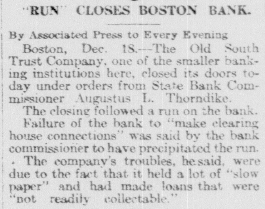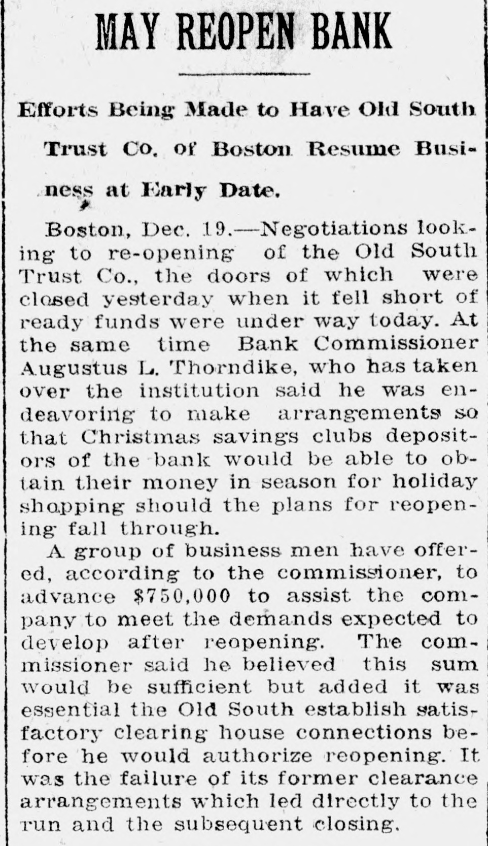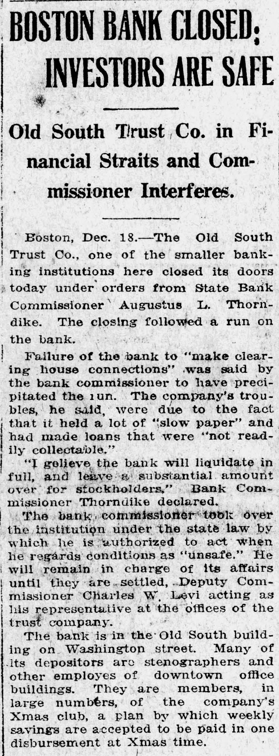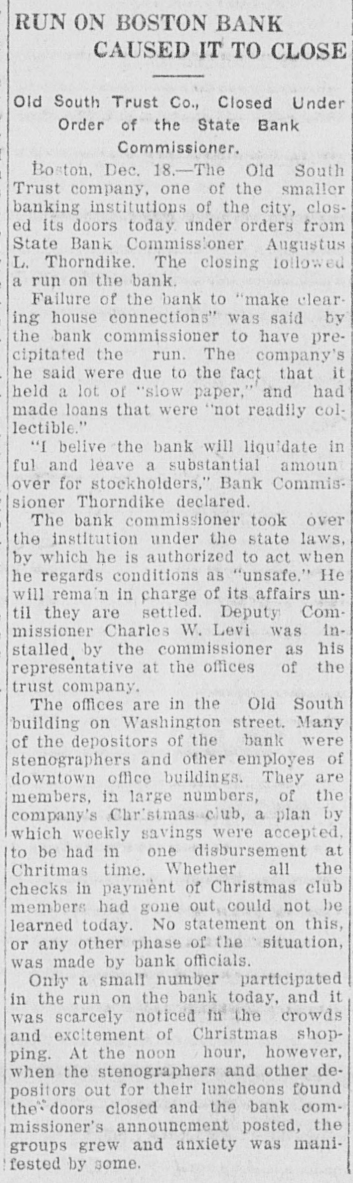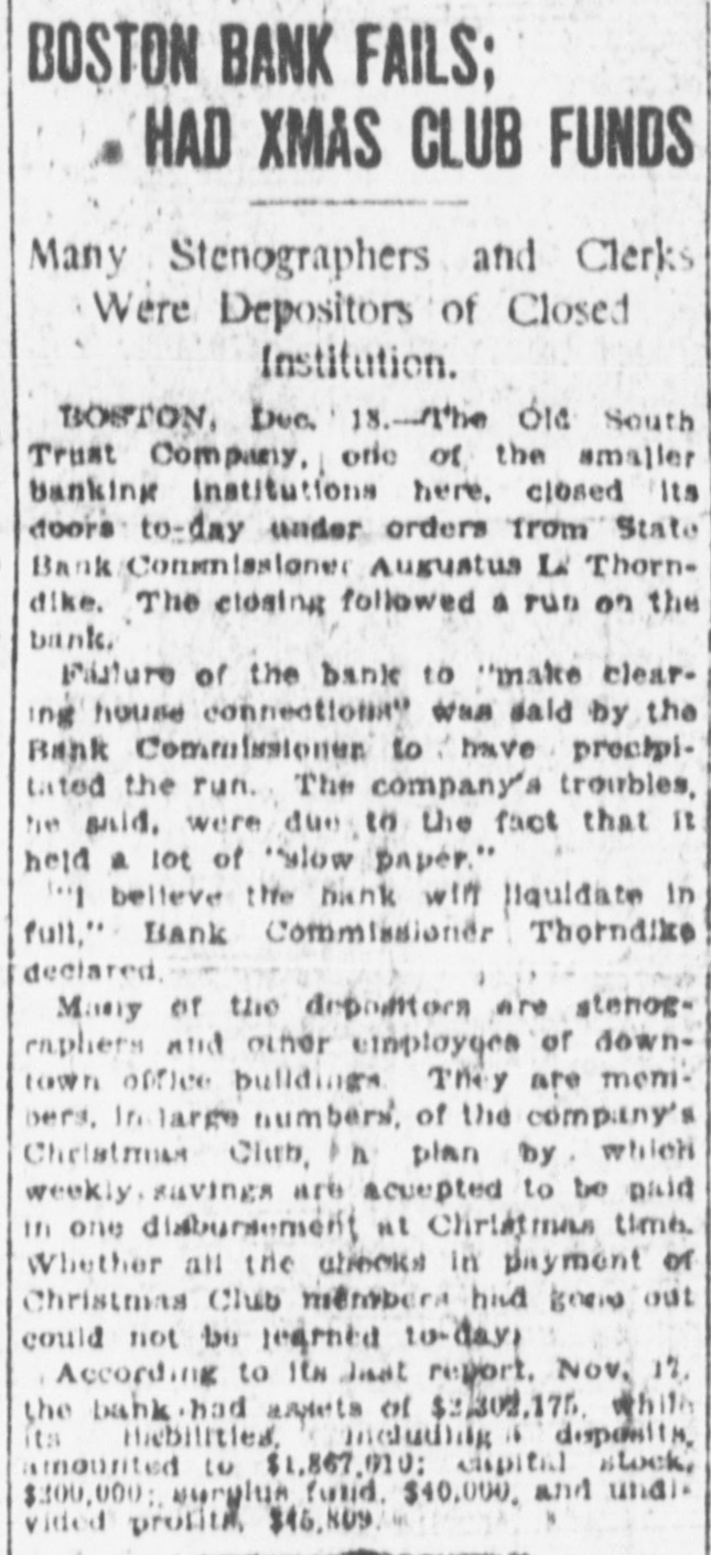 TREMONT TRUST CO., DORCHESTER TRUST FIDELITY TRUST CO. Bank Commissioner Allen Advised Resort to the Law Which Requires 90Day Notice Before Withdrawal of Funds-All Them Are Believed to Be Able to Meet Calls. Boston, Sept. 27 Public unrest over conditions to-day caused a some institutions rerun banking on Trust with the sult that the Tremont company the Fidelity Trust company and the Dorchester Trust company invoked the law which makes it possible to require ninety days notice of withdrawals from the savings departments, in or der to stop the rush of frightened de positors. the Tremont Trust com was in by pany The run participated on crowd hundreds bethe of the so that were called upon to and and came afoot, proportions great police, mounted keep in order! The bank sought for hour to meet the officials announced was the it. and an crowd claims all, there but against the money on hand to pay Vice crush became so great that President Simon Swig announced that the ninety-day notice would be required. At the Fidelity Trust company, which also has offices in the downtown district, the run was in smaller volume, but the law was called upon, to it was stated. "to allow the public recover from the prevailing unrest. There has been a run on the Dorches ter Trust company for several days; and the invocation of the law there stopped the payments. Officials of the institutions in several instances announced by statement or advertisement that there was no connection between the Cosmopolitan, which was the fifth bank to be closed here within two months, and their in stitutions, and Bank Commissioner Joseph C. Allen declared that no other banking institution was involved in the Coemopolitan's troubles. Nevertheless, a recurrence of the runs was an ticipated in some degree. depositors having become alarmed and, in the case of the Tremont Trust company, having made constant hdrawals from morning Saturday almost to midnight, the management having ex a tended the closing hour from noon to accommodate them. The feeling of uncertainty over the banking situation was the subject of discussion by Governor Coolidge and bankers yesterday, but without an nouncement of any contemplated ac tion. One effect of the close scrutiny of the affairs of local banks, which Commissioner Allen has been making, was an order from him to the management of the Old South Trust company to drop M from its payroll former Governor Sam uel W. McCall and four other officials, As M including two ce-presidents chairman of the board of directors of the company, McCall, who was ap pointed recently, is drawing a salary el of $8,000 a year, and the other men involved are said to be receiving sev earal thousand dollars each. a The object of the order is to reduce f the bank's expenses. and it is the opinion of the bank commissioner that D the men whom he asked to have dropped are holding merely nominal positions for which the salaries might to well be saved. In each instance, they may continue to serve in their present capacities without salary, according to the order from the bank commissioner to the Old South management. The Old South Trust company was M closed a year ago and re-opened re to cently after having rehabilitated its finances without loss to the depositors of Several hundred persons had gath ered outside the offices of the Tremont W Trust company when the doors were th opened at 8:45. fifteen minutes before as the usual hour and lines quickly formed tl before the several paying tellers' win dows. After withdrawals had been going on steadily for nearly an hour & with the crowds constantly increasing be the bank officials announced that the m law permitting a bank to require 90 days' notice for withdrawals from the savings department would be invoked forthwith "for the protection of the m depositors. The regulation would be m withdrawn "as soon as the public th calmed itself. it was announced M We have plenty of money to pay everybody. officials said. "and we're prepared to do so this morning, but at he crowd became so large that it was el impossible to handle them and we in is roked the law for the protection of the he depositors, not for our own protec iden. The Fidelity Trust company also served notice on depositors that it f would take advantage of the 90 days ke law. It was stated at the bank that ha this was done upon the direction of the bank commissioner At the office of