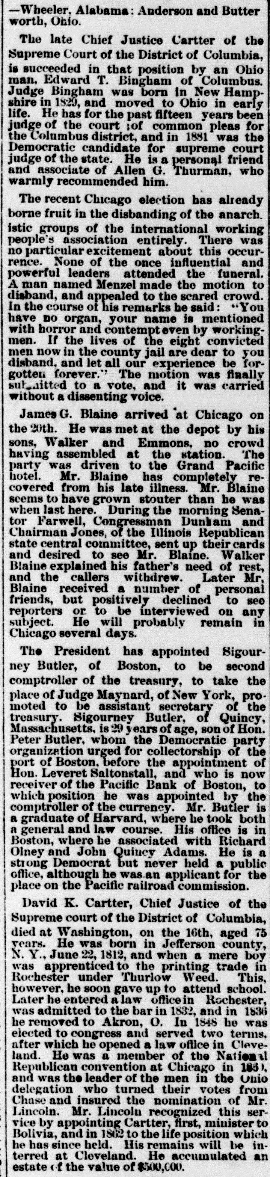 -Wheeler, Alabama: Anderson and Butter worth, Ohio. The late Chief Justice Cartter of the Supreme Court of the District of Columbia, is succeeded in that position by an Ohio man. Edward T. Bingham of Columbus. Judge Bingham was born in New Hamp. shire in 1829, and moved to Ohio in early life. He has for the past fifteen years been judge of the court of common pleas for the Columbus district, and in 1881 was the Democratic candidate for supreme court judge of the state. He is a personal friend and associate of Allen G. Thurman. who warmly recommended him. The recent Chicago election has already borne fruit in the disbanding of the anarch. istic groups of the international working people's association entirely. There was no particular excitement about this occurrence. None of the once influential and powerful leaders attended the funeral. A man named Menzel made the motion to disband, and appealed to the scared crowd. In the course of his remarks be said: 'You have DO organ, your name is mentioned with horror and contempteven by workingmen. If the lives of the eight convicted men now in the county jail are dear to you disband, and let all our experience be forgotten forever." The motion was finally nitted to a vote, and it was carried without a dissenting voice. James G. Blaine arrived at Chicago on the 20th. He was met at the depot by bis sons, Walker and Emmons. no crowd having assembled at the station. The party was driven to the Grand Pacific hotel. Mr. Blaine has completely recovered from his late illness. Mr. Blaine seems to have grown stouter than he was when last here. During the morning Senator Farwell, Congressman Dunkam and Chairman Jones, of the Illinois Republican state central committee, sent up their cards and desired to see Mr. Blaine. Walker Blaine explained his father's need of rest, and the callers withdrew. Later Mr. Blaine received a number of personal friends, but positively declined to see reporters or to be interviewed on any subject. He will probably remain in Chicago several days. The President has appointed Sigourney Butler, of Boston, to be second comptroller of the treasury, to take the place of Judge Maynard, of New York, promoted to be assistant secretary of the treasury. Sigourney Butler, of Quincy, Massachusetts, is 29 years of age, son of Hon. Peter Butler. whom the Democratic party organization urged for collectorship of the port of Boston. before the appointment of Hon. Leveret Saltonstall, and who is now receiver of the Pacific Bank of Boston, to which position he was appointed by the comptroller of the currency. Mr. Butler is a graduate of Harvard, where he took both a general and law course. His office is in Boston, where he associated with Richard Olney and John Quiucy Adams. He is a strong Democrat but never held a public office, although he was an applicant for the place on the Pacific railroad commission. David K. Cartter, Chief Justice of the Supreme court of the District of Columbia, died at Washington, on the 16th, aged 75 years. He was born in Jefferson county, N. Y., June 22, 1812, and when a mere boy was apprenticed to the printing trade in Rochester under Thurlow Weed. This, however, he soon gave up to attend school. Later he entered a law officein Rochester, was admitted to the bar in 1832, and in 1836 he removed to Akron, O. In 1848 be was elected to congress and served two terms. after which he opened a law office in Cleveland. He was a member of the National Republican convention at Chicago in 1851. and was the leader of the men in the Onio delegation who turned their votes from Chase and insured the nomination of Mr. Lincoln. Mr. Lincoln recognized this service by appointing Cartter, first, minister to Bolivia, and in 1862 to the life position which he has since held. His remains will be interred at Cleveland. He accumulated an estate (if the value of $500,000.