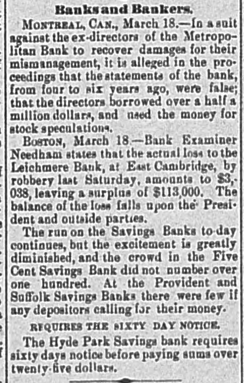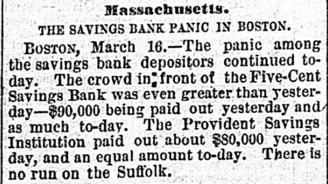 BANK TROUBLES. RUN ON BOSTON SAVINGS BANKS. A PANIC AMONG DEPOSITORS-THE FIVE CENT BANK pronounced SOLVENT-ONLY THREE BANKS PAYING ON DEMAND-ACTION OF THE STATE SENATE. BOSTON, March 15.-The run on the Boston Five Cent Savings Bank, which begun yesterday, has developed to a general panic among savings banks depositors. School-st., where the Five Cent Bank is situated, has been blockaded by a crowd to-day, and the excitement has been intense. The committee, which have been engaged in examining the securities of this bank for the past two weeks, say that after deducting all the depreciation which the assets, embracing stocks, bonds, etc., have suffered since the last statement of the bank was made. and allowing $167,000 with which to pay interest falling due on the 1st of April, the bank will still have a surplus of $429,000. The uneasiness has spread to the Franklin Bank on Boylston-st., one of the strongest savings institutions in the country, the managers of which have applied the brakes in season to prevent the calamity which has overtaken some other banks. The amount paid to dopositors on demand has been limited to $25, and sixty days' notice is required for all sums over that amount. This reduces the number of banks in Boston which are paying in full on demand, to three. An unusually large number of depositors in the Provident Institution for Savings, partaking of the general scare, applied for and obtained their money to-day, and the same is true of the Suffolk Bank; although these banks are, as far as is known, solvent to the last degree. The bill enlarging the powers of Savings Bank commissioners passed the Senate to day. It empowers commissioners, when the security of depositors requires limitation of payments, to direct any savings bank as to the time and amount of payments, and any person aggrieved by such Order shall have the right to uppeal within thirty days to the Supreme Judicial Court.