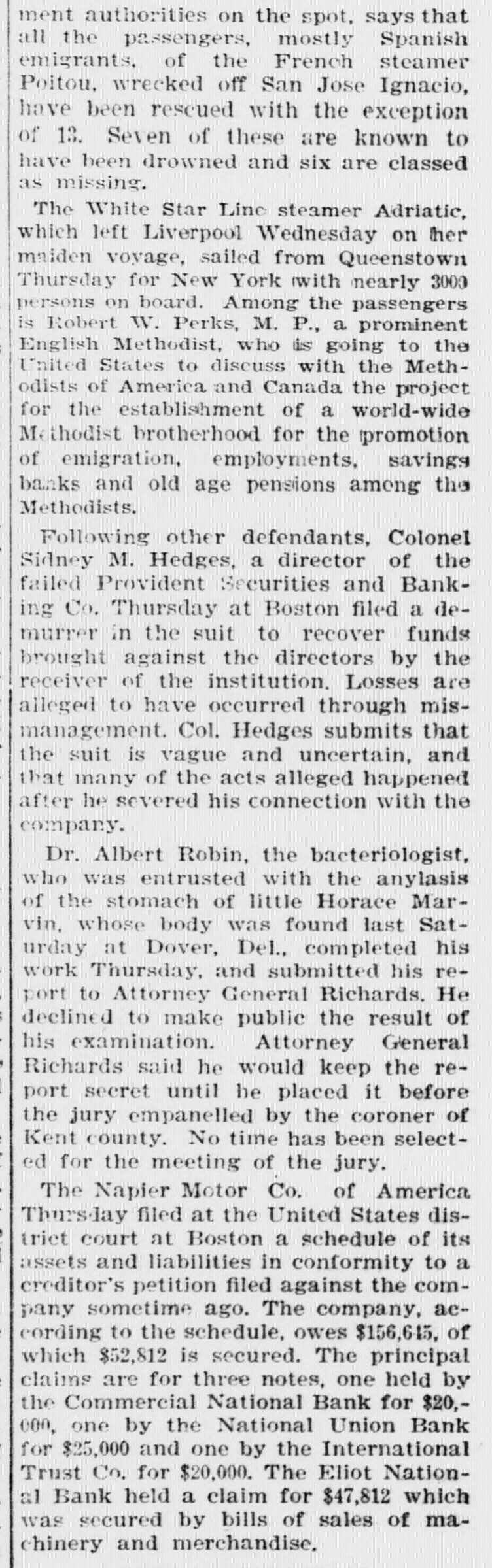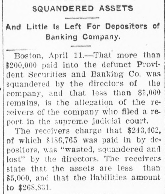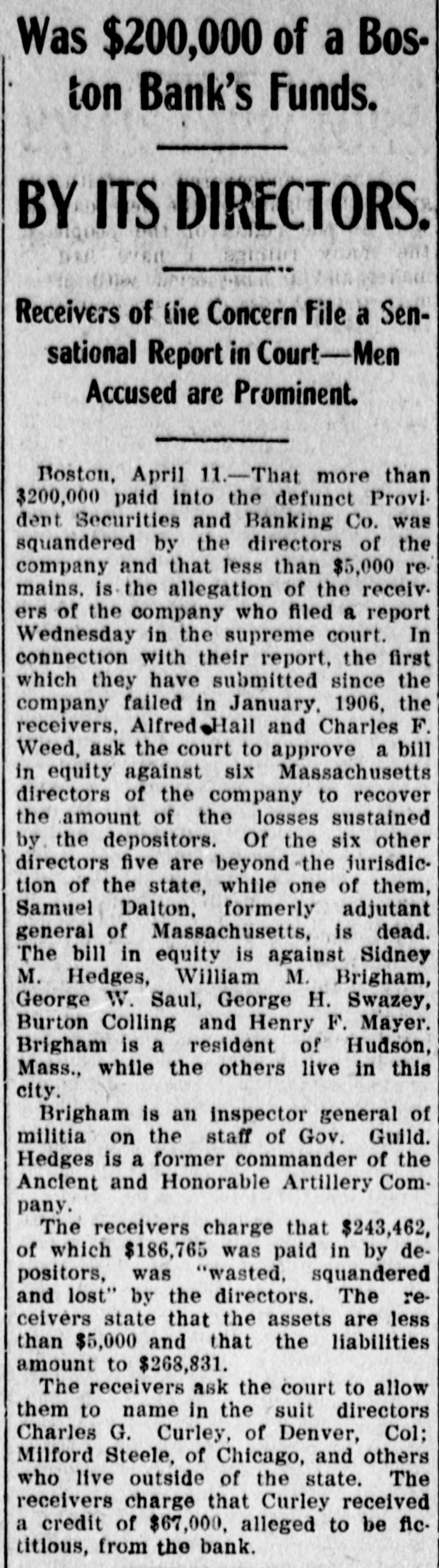 Was $200,000 of a Boston Bank's Funds. BY ITS DIRECTORS. Receivers of the Concern File a Sensational Report in Court-Men Accused are Prominent. Boston, April 11.-That more than $200,000 paid into the defunct Provident Securities and Banking Co. was squandered by the directors of the company and that less than $5,000 remains, is the allegation of the receivers of the company who filed a report Wednesday in the supreme court. In connection with their report, the first which they have submitted since the company failed in January, 1906, the receivers, Alfred Hall and Charles F. Weed, ask the court to approve a bill in equity against six Massachusetts directors of the company to recover the amount of the losses sustained by. the depositors. Of the six other directors five are beyond the jurisdiction of the state, while one of them, Samuel Dalton, formerly adjutant general of Massachusetts, is dead. The bill in equity is against Sidney M. Hedges, William M. Brigham, George W. Saul, George H. Swazey, Burton Colling and Henry F. Mayer. Brigham is a resident of Hudson, Mass., while the others live in this city. Brigham is an inspector general of militia on the staff of Gov. Guild. Hedges is a former commander of the Ancient and Honorable Artillery Company. The receivers charge that $243,462, of which $186,765 was paid in by depositors, was "wasted, squandered and lost" by the directors. The receivers state that the assets are less than $5,000 and that the liabilities amount to $268,831. The receivers ask the court to allow them to name in the suit directors Charles G. Curley, of Denver, Col; Milford Steele, of Chicago, and others who live outside of the state. The receivers charge that Curley received a credit of $67,000, alleged to be fictitious, from the bank.