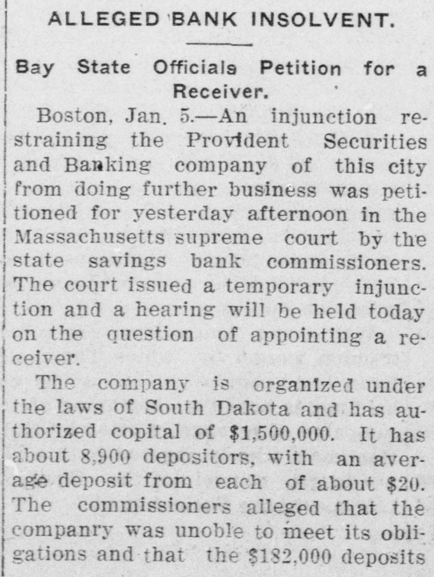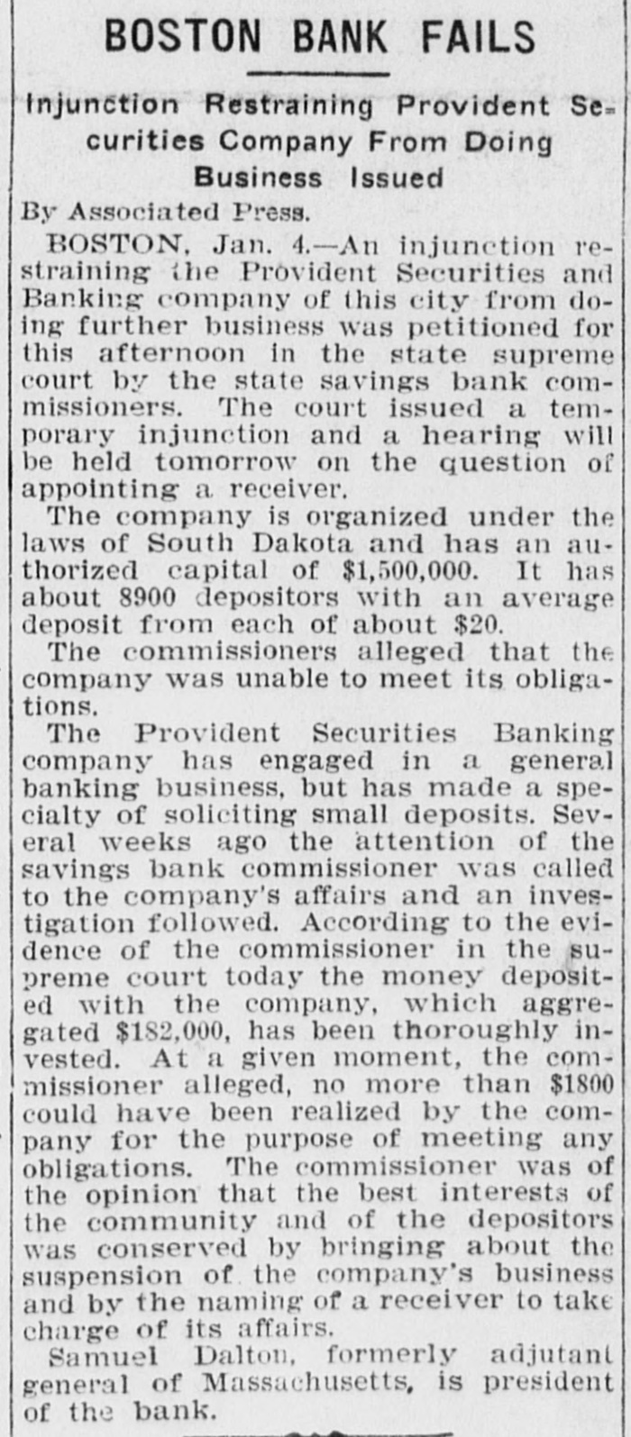 BOSTON BANK FAILS Injunction Restraining Provident Se= curities Company From Doing Business Issued By Associated Press. BOSTON, Jan. 4.-An injunction restraining the Provident Securities and Banking company of this city from doing further business was petitioned for this afternoon in the state supreme court by the state savings bank commissioners. The court issued a temporary injunction and a hearing will be held tomorrow on the question of appointing a receiver. The company is organized under the laws of South Dakota and has an authorized capital of $1,500,000. It has about 8900 depositors with an average deposit from each of about $20. The commissioners alleged that the company was unable to meet its obligations. The Provident Securities Banking company has engaged in a general banking business, but has made a specialty of soliciting small deposits. Several weeks ago the attention of the savings bank commissioner was called to the company's affairs and an investigation followed. According to the evidence of the commissioner in the supreme court today the money deposited with the company, which aggregated $182,000, has been thoroughly invested. At a given moment, the commissioner alleged, no more than $1800 could have been realized by the company for the purpose of meeting any obligations. The commissioner was of the opinion that the best interests of the community and of the depositors was conserved by bringing about the suspension of the company's business and by the naming of a receiver to take charge of its affairs. Samuel Dalton, formerly adjutant general of Massachusetts, is president of the bank.