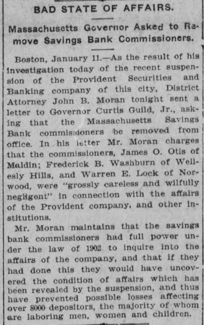 BAD STATE OF AFFAIRS. Massachusetts Governor Asked to Remove Savings Bank Commissioners. Boston, January 11.-As the result of his investigation today of the recent suspension of the Provident Securities and Banking company of this city, District Attorney John B. Moran tonight sent a letter to Governor Curtis Guild, Jr., asking that the Massachusetts Savings Bank commissioners be removed from office. In his letter Mr. Moran charges that the commissioners, James O. Otis of Maldin; Frederick B. Washburn of Wellesly Hills, and Warren E. Lock of Norwood, were "grossly careless and wilfully negligent" in connection with the affairs of the Provident company, and other institutions. Mr. Moran maintains that the savings bank commissioners had full power under the law of 1902 to inquire into the affairs of the company, and that if they had done this they would have uncovered the condition of affairs which has been revealed by the suspension, and thus have prevented possible losses affecting over 8000 depositors, the majority of whom are laboring men, women and children.