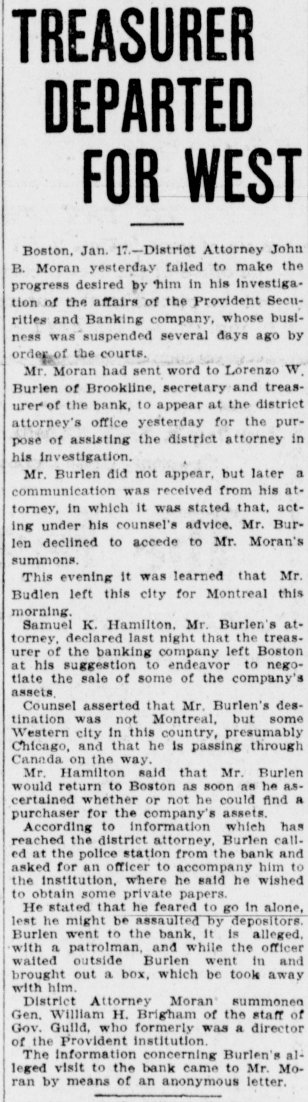 TREASURER DEPARTED FOR WEST Boston, Jan. 17.-District Attorney John B. Moran yesterday failed to make the progress desired by him in his investigation of the affairs of the Provident Securities and Banking company, whose business was suspended several days ago by order of the courts. Mr. Moran had sent word to Lorenzo W. Burlen of Brookline, secretary and treasurer of the bank, to appear at the district attorney's office yesterday for the purpose of assisting the district attorney in his investigation. Mr. Burlen did not appear, but later a communication was received from his attorney, in which it was stated that, acting under his counsel's advice. Mr. Burlen declined to accede to Mr. Moran's summons. This evening it was learned that Mr. Budlen left this city for Montreal this morning. Samuel K. Hamilton. Mr. Burlen's attorney, declared last night that the treas. urer of the banking company left Boston at his suggestion to endeavor to negotlate the sale of some of the company's assets, Counsel asserted that Mr. Burlen's destination was not Montreal, but some Western city in this country, presumably Chicago, and that he is passing through Canada on the way. Mr. Hamilton said that Mr. Burlen would return to Boston as soon as he ascertained whether or not he could find a purchaser for the company's assets. According to information which has reached the district attorney, Burlen called at the police station from the bank and asked for an officer to accompany him to the institution, where he said he wished to obtain some private papers. He stated that he feared to go in alone, lest he might be assaulted by depositors. Burlen went to the bank, it is alleged, with a patrolman, and while the officer waited outside Burlen went in and brought out a box, which be took away with him. District Attorney Moran summonea Gen. William H. Brigham of the staff of Gov. Guild, who formerly was a director of the Provident institution. The information concerning Burlen's alleged visit to the bank came to Mr. Moran by means of an anonymous letter.