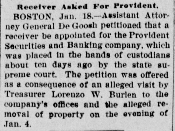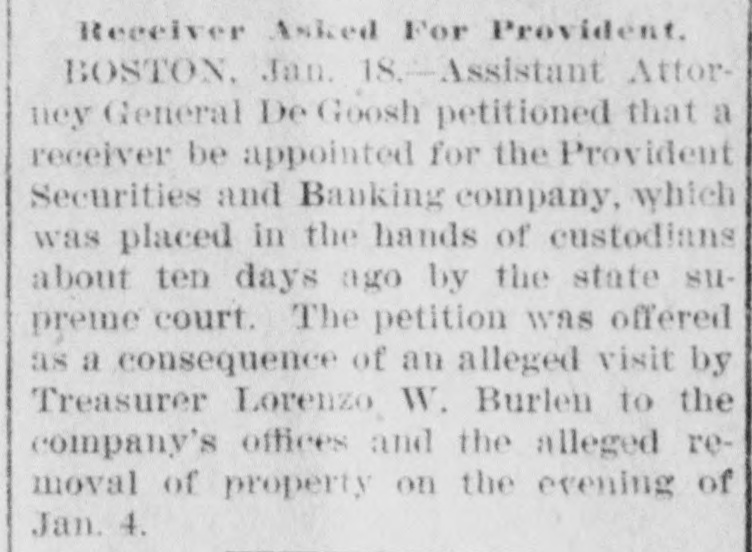 Receiver Asked For Provident. BOSTON, Jan. 18. -Assistant Attorney General De Goosh petitioned that a receiver be appointed for the Provident Securities and Banking company, which was placed in the hands of custodians about ten days ago by the state supreme court. The petition was offered as a consequence of an alleged visit by Treasurer Lorenzo W. Burlen to the company's offices and the alleged removal of property on the evening of Jan. 4.
