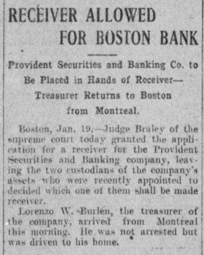 RECEIVER ALLOWED FOR BOSTON BANK Provident Securities and Banking Co. to Be Placed in Hands of ReceiverTreasurer Returns to Boston from Montreal. Boston, Jan. 19. Judge Braley of the supreme court today granted the application for a receiver for the Provident Securities and Banking company, leaving the two custodians of the company's assets who were recently appointed to decided which one of them shall be made receiver. Lorenzo W. Burlen, the treasurer of the company, arrived from Montreal this morning. He was not arrested but was driven to his home.