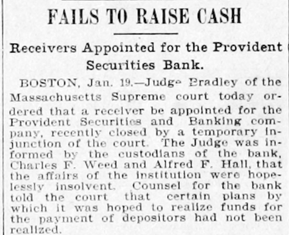 FAILS TO RAISE CASH Receivers Appointed for the Provident Securities Bank. BOSTON, Jan. 19.-Judge Bradley of the Massachusetts Supreme court today ordered that a receiver be appointed for the Provident Securities and Banking company, recently closed by a temporary injunction of the court The Judge was informed by the custodians of the bank, Charles F. Weed and Alfred F. Hall, that the affairs of the institution were hopelessly insolvent Counsel for the bank told the court that certain plans by which it was hoped to realize funds for the payment of depositors had not been realized.