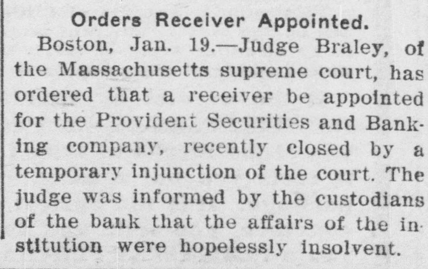 Orders Receiver Appointed. Boston, Jan. 19.-Judge Braley, of the Massachusetts supreme court, has ordered that a receiver be appointed for the Provident Securities and Banking company, recently closed by a temporary injunction of the court. The judge was informed by the custodians of the bauk that the affairs of the institution were hopelessly insolvent.