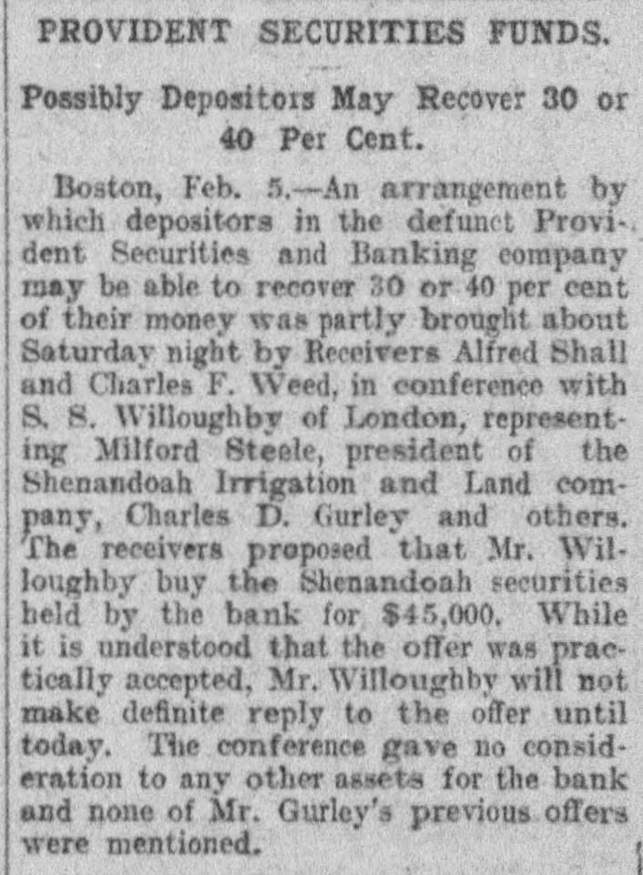 PROVIDENT SECURITIES FUNDS. Possibly Depositors May Recover 30 or 40 Per Cent. Boston, Feb. 5.-An arrangement by which depositors in the defunct Provident Securities and Banking company may be able to recover 30 or 40 per cent of their money was partly brought about Saturday night by Receivers Alfred Shall and Charles F. Weed, in conference with S. 8. Willoughby of London, representing Milford Steele, president of the Shenandoah Irrigation and Land company, Charles D. Gurley and others. The receivers proposed that Mr. Willoughby buy the Shenandoah securities held by the bank for $45,000. While it is understood that the offer was practically accepted, Mr. Willoughby will not make definite reply to the offer until today. The conference gave no consideration to any other assets for the bank and none of Mr. Gurley's previous offers were mentioned.