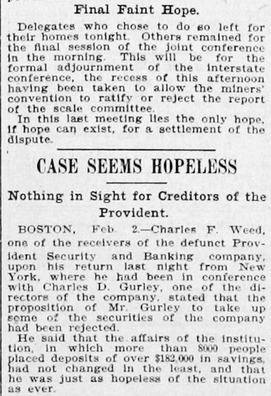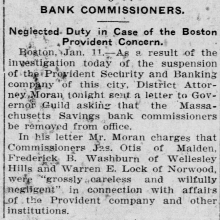 BANK COMMISSIONERS. Neglected. Duty in Case of the Boston Provident Concern. Boston, Jan. 11.-As a result of the investigation today of the suspension of the Provident Security and Banking company of this city, District Attorney Moran tonight sent a letter to Governor Guild asking that the Massachusetts Savings bank commissioners be removed from office. In his letter Mr. Moran charges that Commissioners J2S. Otis of Malden, Frederick B. Washburn of Wellesley Hills and Warren E. Lock of Norwood, were "grossly careless and wilfully negligent" in connection with affairs of the Provident company and other institutions.
