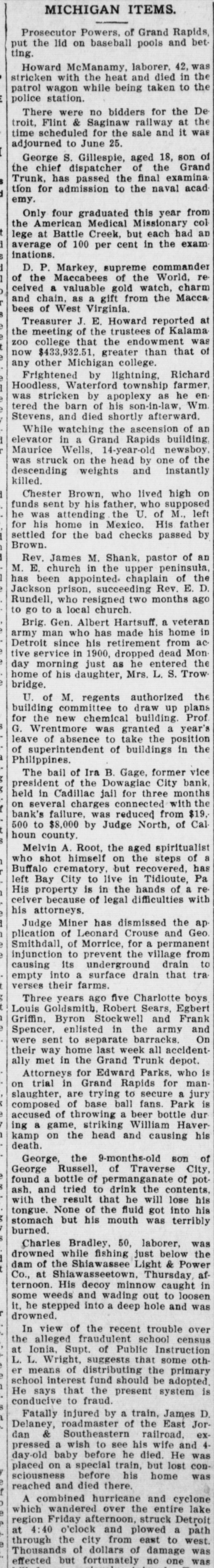 While watching the ascension of an elevator in a Grand Rapids building, Maurice Wells, 14-year-old newsboy, was struck on the head by one of the descending weights and instantly killed.