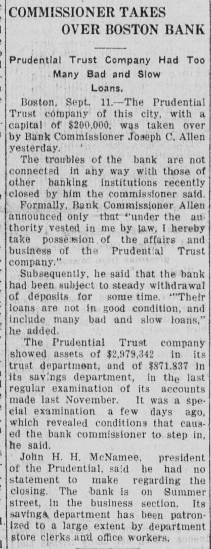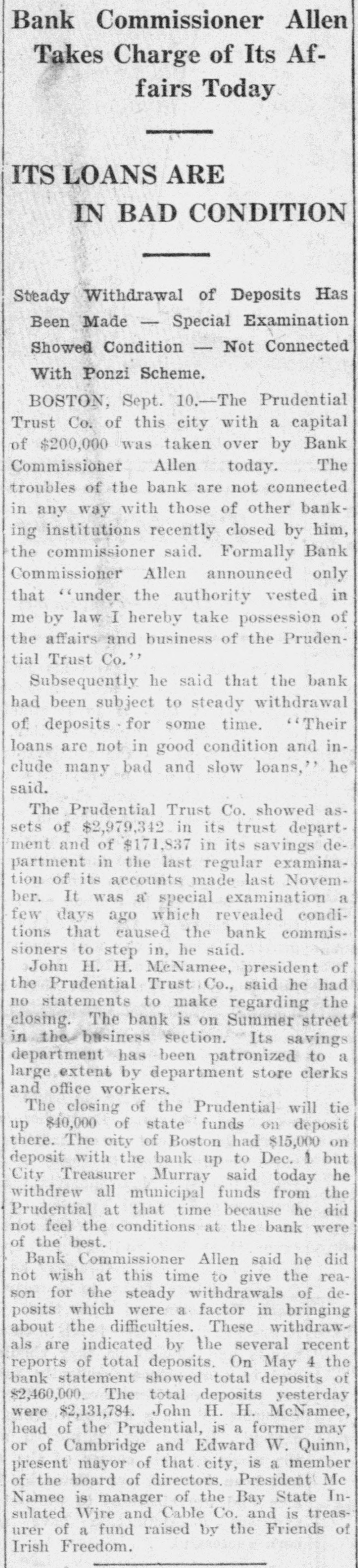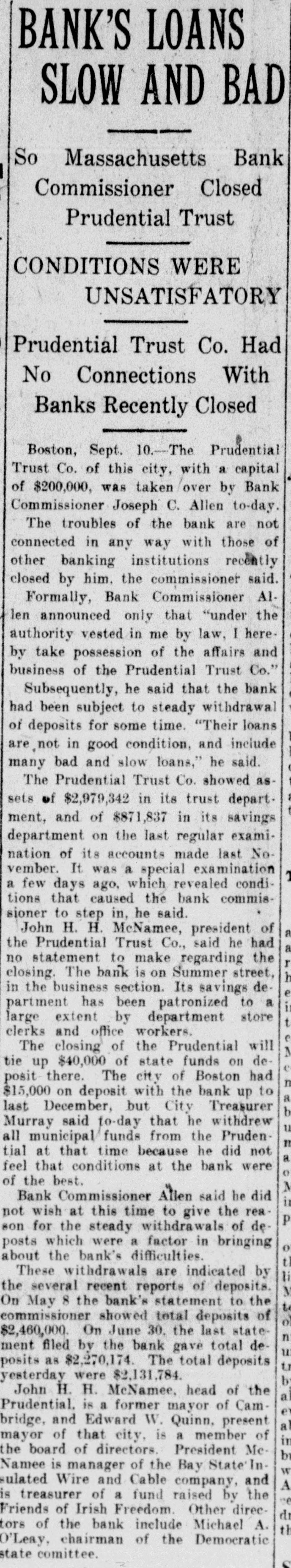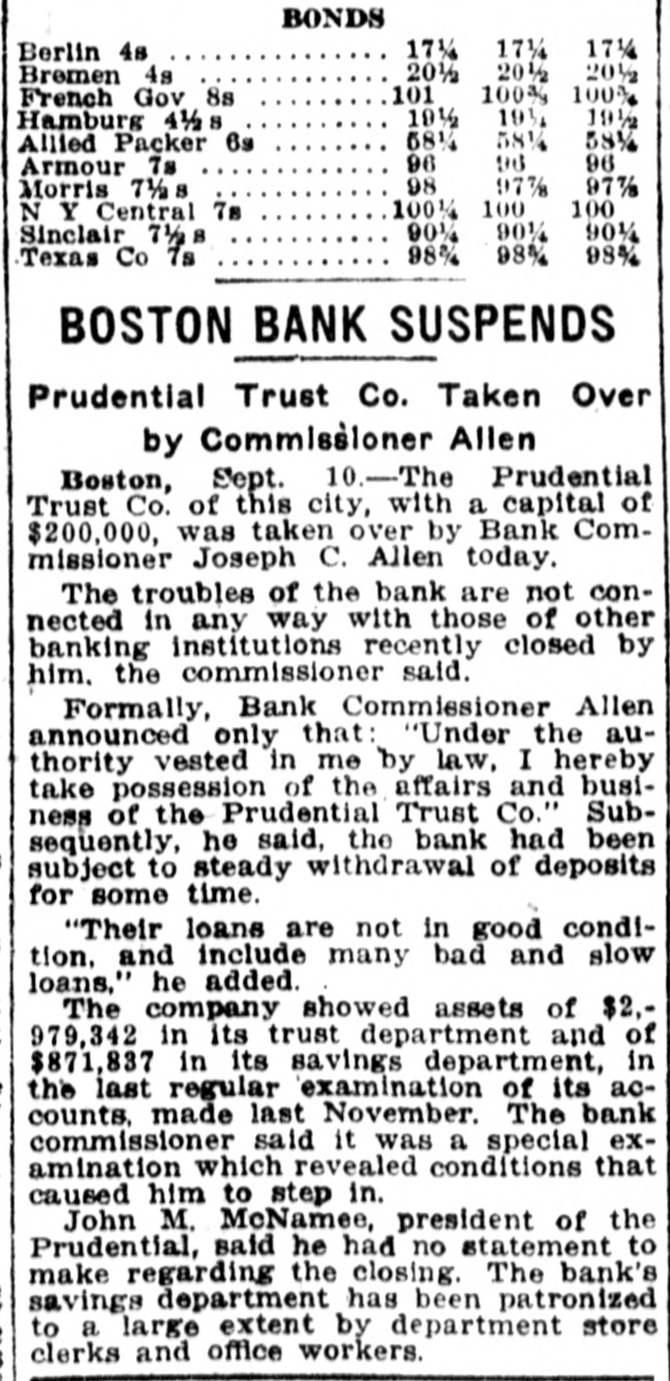 BONDS 17½ 17½ 17½ Berlin 4s 20½ 20½ 20½ Bremen 4s 101 100% 100% French Gov 8s 19½ 19½ 19½ Hamburg 41/28 58½ 58% 58% Allied Packer 6g 96 96 96 Armour 7a 98 97% 97% Morris 7½ 100 100 1001/4 N Y Central 7s 90% 901/4 901/4 Sinclair 7½8 98% 98% 98% Texas Co 7s BOSTON BANK SUSPENDS Prudential Trust Co. Taken Over by Commissioner Allen Boston, Sept. 10.-The Prudential Trust Co. of this city, with a capital of $200,000, was taken over by Bank Commissioner Joseph C. Allen today. The troubles of the bank are not connected in any way with those of other banking institutions recently closed by him. the commissioner said. Formally, Bank Commissioner Allen announced only that: "Under the authority vested in me by law, I hereby take possession of the affairs and business of the Prudential Trust Co." Subsequently, he said, the bank had been subject to steady withdrawal of deposits for some time. "Their loans are not in good condition. and include many bad and slow loans," he added. The company showed assets of $2,979,342 in its trust department and of $871,837 in its savings department, in the last regular examination of its accounts, made last November. The bank commissioner said it was a special examination which revealed conditions that caused him to step in. John M. McNamee, president of the Prudential, said he had no statement to make regarding the closing. The bank's savings department has been patronized to a large extent by department store clerks and office workers.