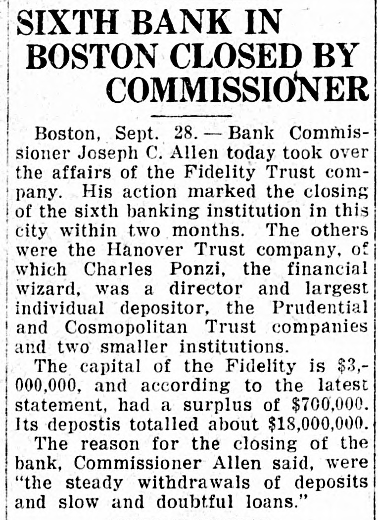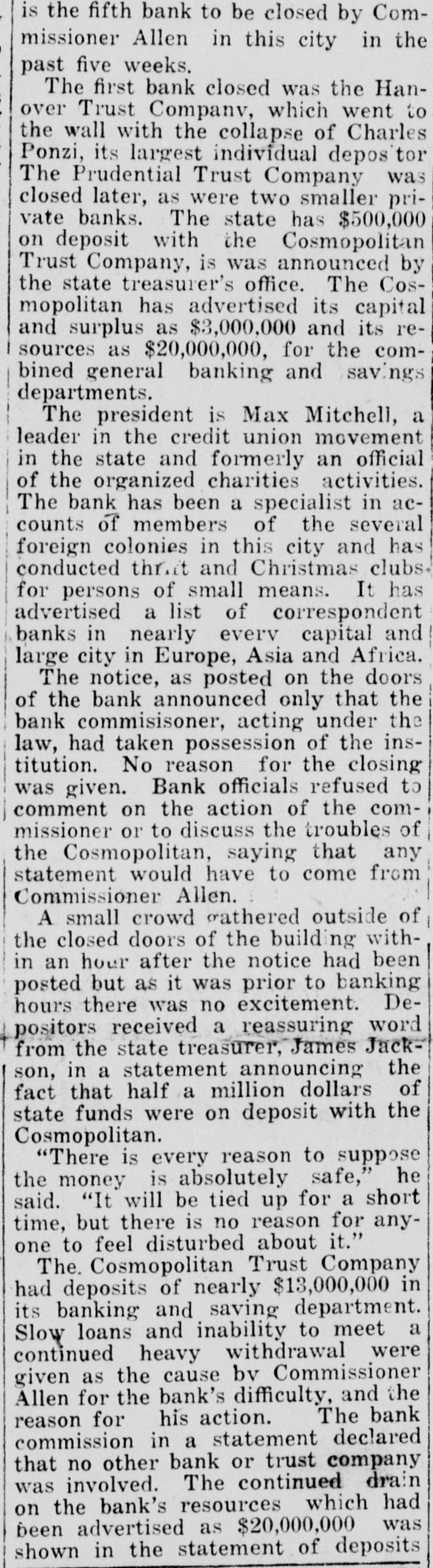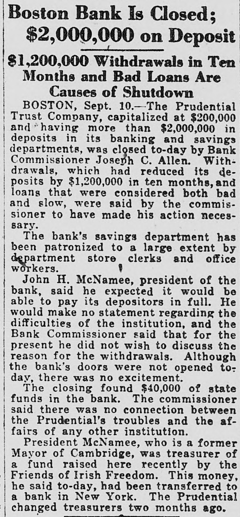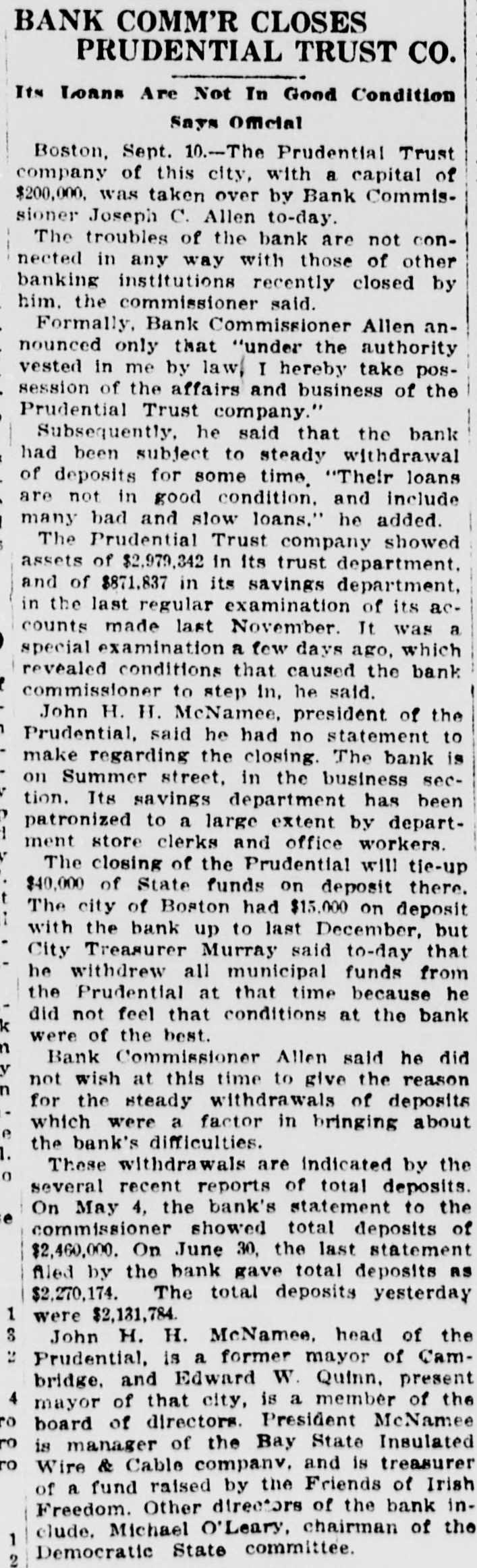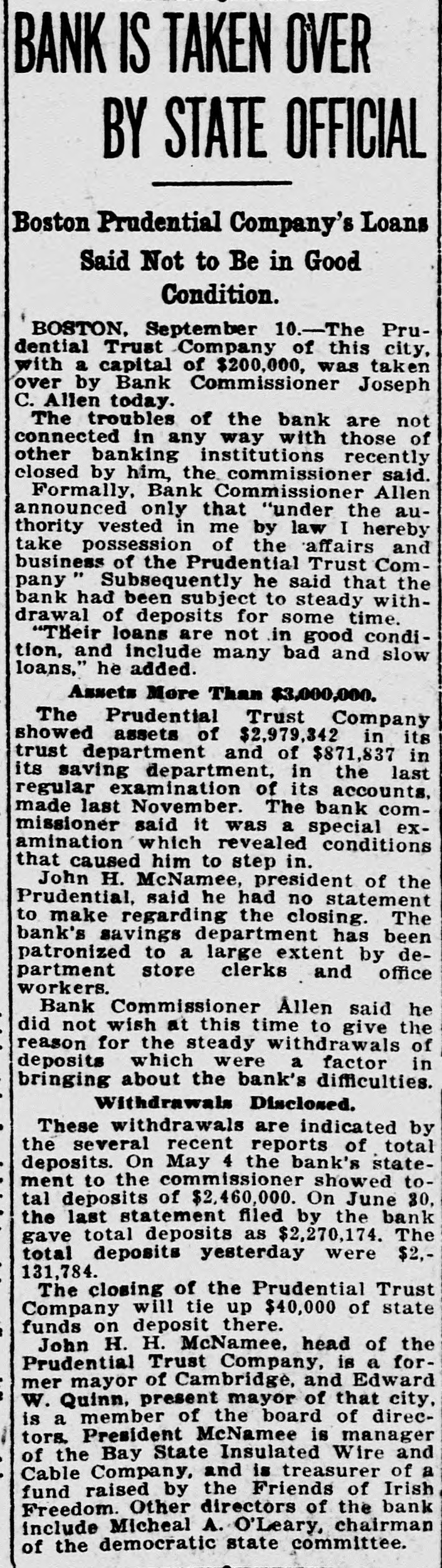 BONDS 17½ 17½ 17½ Berlin 4s 20½ 20½ 20½ Bremen 4s 101 100% 100% French Gov 8s 19½ 19½ 19½ Hamburg 41/28 58½ 58% 58% Allied Packer 6g 96 96 96 Armour 7a 98 97% 97% Morris 7½ 100 100 1001/4 N Y Central 7s 90% 901/4 901/4 Sinclair 7½8 98% 98% 98% Texas Co 7s BOSTON BANK SUSPENDS Prudential Trust Co. Taken Over by Commissioner Allen Boston, Sept. 10.-The Prudential Trust Co. of this city, with a capital of $200,000, was taken over by Bank Commissioner Joseph C. Allen today. The troubles of the bank are not connected in any way with those of other banking institutions recently closed by him. the commissioner said. Formally, Bank Commissioner Allen announced only that: "Under the authority vested in me by law, I hereby take possession of the affairs and business of the Prudential Trust Co." Subsequently, he said, the bank had been subject to steady withdrawal of deposits for some time. "Their loans are not in good condition. and include many bad and slow loans," he added. The company showed assets of $2,979,342 in its trust department and of $871,837 in its savings department, in the last regular examination of its accounts, made last November. The bank commissioner said it was a special examination which revealed conditions that caused him to step in. John M. McNamee, president of the Prudential, said he had no statement to make regarding the closing. The bank's savings department has been patronized to a large extent by department store clerks and office workers.