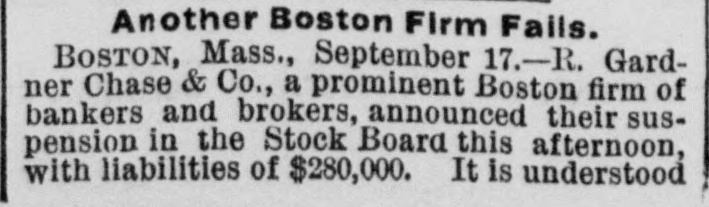 Another Boston Firm Fails. BOSTON, Mass., September 17.-R. Gardner Chase & Co., a prominent Boston firm of bankers and brokers, announced their suspension in the Stock Board this afternoon, with liabilities of $280,000. It is understood