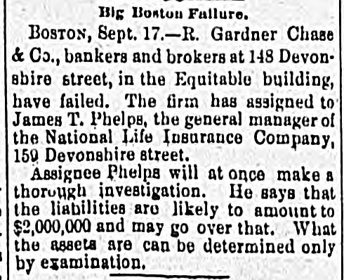 Big Boston Failure. BOSTON, Sept. 17.-R. Gardner Chase & Co., bankers and brokers at 148 Devonsbire street, in the Equitable building, have failed. The firm has assigned to James T. Phelps, the general manager of the National Life Insurance Company, 150 Devonshire street. Assignee Phelps will at once make a thorough investigation. He says that the liabilities are likely to amount to $2,000,000 and may go over that. What the assets are can be determined only by examination.