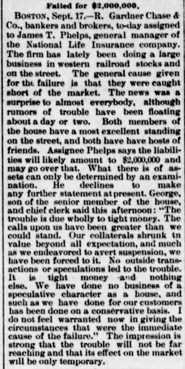 Failed for $2,000,000. BOSTON, Sept. 17.-R. Gardner Chase & Co., bankers and brokers, to-day assigned to James T. Phelps, general manager of the National Life Insurance company. The firm has lately been doing a large business in western railroad stocks and on the street. The general cause given for the failure is that they were caught short of the market. The news was a surprise to almost everybody, although rumors of trouble have been floating about a day or two. Both members of the house have a most excellent standing on the street, and both have have hosts of friends. Assignee Phelps says the liabilities will likely amount to $2,000,000 and may go over that. What there is of assets can only be determined by an examination. He declines to make any further statement at present. George, son of the senior member of the house, and chief clerk said this afternoon: "The trouble is due wholly to tight money. The calls upon us have been greater than we could stand. Our collaterals shrunk tn value beyond all expectation, and much as we endeavored to avert suspension, we have been forced to it. No outside transactions or speculations led to the trouble. It is tight money and nothing else. We have done no business of a speculative character as a house, and such as we have done for our customers has been done on a conservative basis. I do not feel warranted now in giving the circumstances that were the immediate cause of the failure." The impression is strong that the trouble will not be far reaching and that its effect on the market will be only temporary.