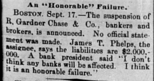 An "Honorable" Failure. BOSTON. Sept. 17.-The suspension of R, Gardner Chase & Co., bankers and brokers. is announced. No official state. ment was made. James T. Phelps, the assignee, says the liabilities are $2.000,000. A bank president said "I don't think any banks will be affected. I think it is an honorable failure."