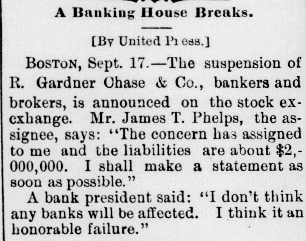 Boston Bankers suspend. BOSTON, Sept. 17.-The suspension of R. Gardner Chase & Co., bankers and brokers, is announced. James T. Phelps, the assignee, says that the liabilities are $2, $2,000,000. A bank president said: "I don't think any of the banks will be RFlected. I think it an honorable failure."