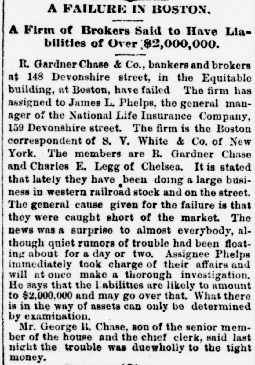 A FAILURE IN BOSTON. A Firm of Brokers Said to Have Liabilities of Over $2,000,000. R. Gardner Chase & Co., bankers and brokers at 148 Devonshire street, in the Equitable building, at Boston, have failed The firm has assigned to James L. Phelps, the general manager of the National Life Insurance Company, 159 Devonshire street. The firm is the Boston correspondent of S. V. White & Co. of New York. The members are R. Gardner Chase and Charles E. Legg of Chelsea. It is stated that lately they have been doing a large business in western railroad stock and on the street. The general cause given for the failure is that they were caught short of the market. The news was a surprise to almost everybody, although quiet rumors of trouble had been floating about for a day or two. Assignee Phelps immediately took charge of their affairs and will at once make a thorough investigation. He says that the Labilities are likely to amount to $2,000,000 and may go over that. What there is in the way of assets can only be determined by examination. Mr. George R. Chase, son of the senior member of the house and the chief clerk, said last night the trouble was duewholly to the tight money.