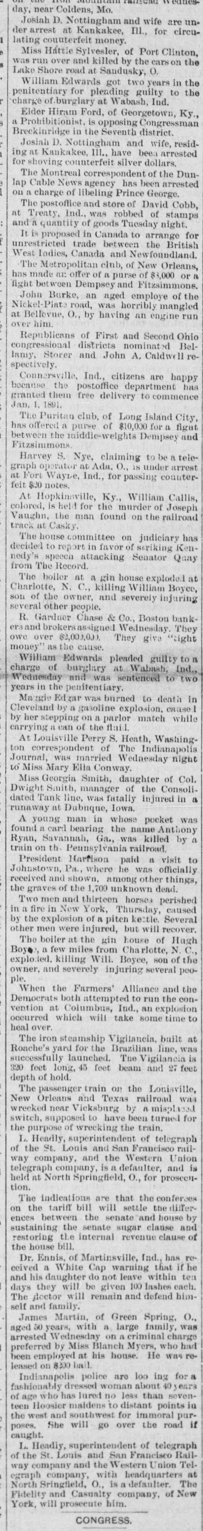 uer arrest at Kankakee, III., for circucounterfeit lating money. of Port over and killed by the was Miss run Hattie Sylvesler, cars on Clinton, the Lake Shore road at Sandusky, 0. got two the for pleading penitentiary William Edwards guilty years to in the charge of.burglary at Wabash, Ind. Elder Hiram Ford, of Georgetown, Ky. a Prohibitionist. is opposing Congressman Breckinridge in the Seventh district. Josiah D. Nottingham and wife, residing at Kankakee, III., have been arrested for shoving counterfeit silver of Dunlap The Cable Montreal correspondent dollars, the News agency has been arrested on a of libeling Prince and store of David was robbed of at The Treaty, charge postoffice Ind., George. stamps Cobb, quantity of goods Canada to trade between British unrestricted and a It is proposed in Tuesday arrange the night. for Canada and club, of New are offer of a of has West The made Iodies, Metropolitan purse Newfoundland, Orleans, Dempsey and Burke, an aged Nickel-Plate fight John between employe Fitzsimmons, $3,000 of or the road, was horribly mangled at Bellevue, O., by having an engine run him Republicans of First and Second Ohio and John A. relamy, congressional Storer districts nominated Caldwell Belspectively. citizens are because Connersville, the postoffice Ind., department happy has rranted them free delivery to commence Jan. 1891. The Puritan club, of Long Island City, has offered a purse of $10,000 for a figut between the middle-weights Dempsey and l'itzsimmons. Harvey S. Nye, claiming to be a teleoperator at Ada, O., 18 under arrest it Waybe, Ind., for countergraph Fort passing feit $20 notes. Ky., William the murder of colored, At Hopkinsville, is held for Joseph Callis, Vaughn, the man found on the railroad track at Casky The house committee on judiciary has decided to report in favor of scriking Kenedy's speech attacking Senator Qaay from The Record. The boiler at a gin house exploded at Charlotte, N. C., killing William Boyce, on of the owner, and severely injuring several other people. R. Gardner Chase & Co., Boston banksand brokersassigned Wednesday. They we over $2,000,000. They giva "tight money" the cause. William Edwards pleaded guilty to a charge of burglary at Wabash, Ind., Wednesday and was sentenced to two years in the penitentiary Mangie Edgar was burned to death in Cleveland by a gazoline explosion, cause.I by her stepping on a parlor match while carrying a can of the fluid. Louisville Perry S. Heath, Washingon correspondent of The Indianapolis Journal, was married Wednesday night o Miss Mary Ella Conway. Miss Georgin Smith, daughter of Col. Dwight Smith, manager of the Consolilated Tank line, was fatally injured in a runaway at Dubuque, Iowa. A young man in whose pocket was found a card bearing the name Anthony a Ryan, Savannah, Ga., was killed by train on th. Peunsylvania railroad President Harfison paid a visit to Johnstown, Pa., where he was officially received and shown, among other things, the graves of the 1,700 unknown dead. Two men and thirteen horse perished 11 a fire in New York, Thursday, caused by the explosion of a piten kettle. Several other men were injured, but will recover. The boiler at the gin house of Hugh Boyse, a few miles from Charlotte, N.C., exploited. killing Will. Boyce, son of the owner, and severely injuring several peole. When the Farmers' Alliance and the Democrats both attempted to run the convention at Columbus, Ind., an explosion occurred which will take some time to heal over. The iron steamship Vigilancia, built at Roache's yard for the Brazilian line, was successfully launched. The Vigilancia is 20 feet long, 45 feet beam and 27 feet depth of hold. The passenger train on the Louisville, New Orleans and Texas railroad was wrecked near Vicksburg by A misplaced switch, supposed to have been turned for the purpose of wrecking the train. L. Headly, superintendent of telegraph of the St. Louis and San Francisco railway company, and the Western Union telegraph company, is a defaulter, and is held at North Springfield, O., for proseenion. The indications are that the conferces n the tariff bill will settle the differences between the senate and house by sustaining the senate sugar clause and restoring the internal revenue clause of the house bill. Dr. Ennis, of Martinsville, Ind., has received a White Cap warning that if he nd his daughter do not leave within tea lays they will be given 100 lashes each. The doctor will remain and defend himself and family. James Martin, of Green Spring, O., aged 50 years, with a large family, was arrested Wednesday on a criminal charge preferred by Miss Blanch Myers, who had been employed at his house. He was released on $200 ball Indianapolis police are loo ing for a fashionably dressed woman about 40 years of age who has lured no less than seventeen Hoosier maidens to distant points in the west and southwest for immoral purposes. She will go over the road if caught. L. Headly, superintendent of telegraph of the St. Louis and San Francisco Railcompany and the Western Union TelO., is a graph way North Sringfield, company, with headquarters defaulter. of New The at Fidelity and Casualty company, York, will prosecute him.