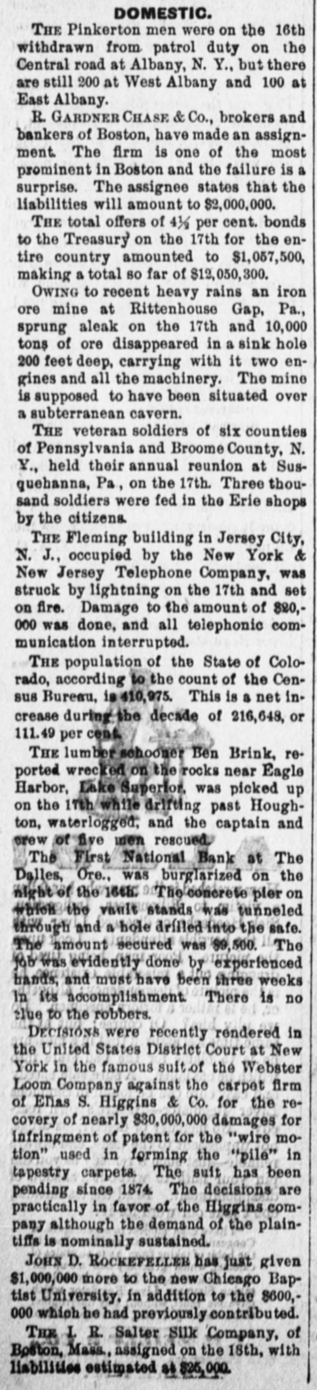 DOMESTIC. THE Pinkerton men were on the 16th withdrawn from patrol duty on the Central road at Albany, N. Y., but there are still 200 at West Albany and 100 at East Albany. R. GARDNER CHASE & Co., brokers and bankers of Boston, have made an assignment. The firm is one of the most prominent in Boston and the failure is a surprise. The assignee states that the liabilities will amount to $2,000,000. THE total offers of 4½ per cent. bonds to the Treasury on the 17th for the entire country amounted to $1,057,500, making a total so far of $12,050,300. OWING to recent heavy rains an iron ore mine at Rittenhouse Gap, Pa., sprung aleak on the 17th and 10,000 tons of ore disappeared in a sink hole 200 feet deep, carrying with it two engines and all the machinery. The mine is supposed to have been situated over a subterranean cavern. THE veteran soldiers of six counties of Pennsylvania and Broome County, N. Y., held their annual reunion at Susquehanna, Pa, on the 17th. Three thousand soldiers were fed in the Erie shops by the citizens. THE Fleming building in Jersey City, N. J., occupied by the New York & New Jersey Telephone Company, was struck by lightning on the 17th and set on fire. Damage to the amount of $20,000 was done, and all telephonic communication interrupted. THE population of the State of Colorado, according to the count of the Census Bureau, is 410,975. This is a net increase during the decade of 216,648, or 111.49 per cent THE lumber schooner Ben Brink, reported wrecked on the rocks near Eagle Harbor, Lake Superior, was picked up on the 17th while drifting past Houghton, waterlogged, and the captain and crew of five men rescued. The First National Bank at The Dalles, Ore., was burglarized on the night of the 16th. The concrete pier on which the vault stands was tunneled through and a hole drilled into the safe. The amount secured was $9,500. The job was evidently done by experienced hands, and must have been three weeks in its accomplishment. There is no tlue to the robbers. DECISIONS were recently rendered in the United States District Court at New York in the famous suit of the Webster Loom Company against the carpet firm of Elias S. Higgins & Co. for the recovery of nearly $30,000,000 damages for infringment of patent for the "wire motion" used in forming the "pile" in tapestry carpets. The suit has been pending since 1874. The decisions are practically in favor of the Higgins company although the demand of the plaintiffs is nominally sustained. JOHN D. ROCKEFELLEE has just given $1,000,000 more to the new Chicago Baptist University. in addition to the $600,000 which he had previously contributed. THE L R. Salter Silk Company, of Boston, Mass, assigned on the 18th, with liabilities estimated at $25,000.