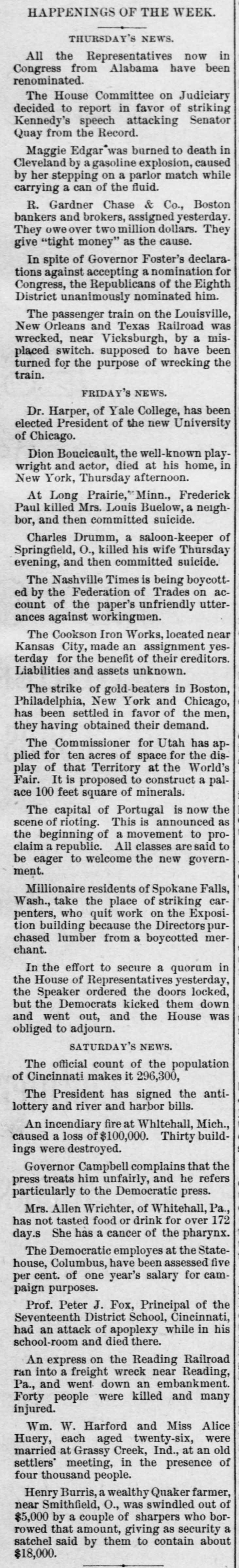 HAPPENINGS OF THE WEEK. THURSDAY'S NEWS. All the Representatives now in Congress from Alabama have been renominated. The House Committee on Judiciary decided to report in favor of striking Kennedy's speech attacking Senator Quay from the Record. Maggie Edgar was burned to death in Cleveland by a gasoline explosion, caused by her stepping on a parlor match while carrying a can of the fluid. R. Gardner Chase & Co., Boston bankers and brokers, assigned yesterday. They owe over two million dollars. They give "tight money" as the cause. In spite of Governor Foster's declarations against accepting a nomination for Congress, the Republicans of the Eighth District unanimously nominated him. The passenger train on the Louisville, New Orleans and Texas Railroad was wrecked, near Vicksburgh, by a misplaced switch. supposed to have been turned for the purpose of wrecking the train. FRIDAY'S NEWS. Dr. Harper, of Yale College, has been elected President of the new University of Chicago. Dion Boucicault, the well-known playwright and actor, died at his home, in New York, Thursday afternoon. At Long Prairie," Minn., Frederick Paul killed Mrs. Louis Buelow, a neighbor, and then committed suicide. Charles Drumm, a saloon-keeper of Springfield, O., killed his wife Thursday evening, and then committed suicide. The Nashville Times is being boycotted by the Federation of Trades on account of the paper's unfriendly utterances against workingmen. The Cookson Iron Works, located near Kansas City, made an assignment yesterday for the benefit of their creditors. Liabilities and assets unknown. The strike of gold-beaters in Boston, Philadelphia, New York and Chicago, has been settled in favor of the men, they having obtained their demand. The Commissioner for Utah has applied for ten acres of space for the display of that Territory at the World's Fair. It is proposed to construct a palace 100 feet square of minerals. The capital of Portugal is now the scene of rioting. This is announced as the beginning of a movement to proclaim a republic. All classes are said to be eager to welcome the new government. Millionaire residents of Spokane Falls, Wash., take the place of striking carpenters, who quit work on the Exposition building because the Directors purchased lumber from a boycotted merchant. In the effort to secure a quorum in the House of Representatives yesterday, the Speaker ordered the doors locked, but the Democrats kicked them down and went out, and the House was obliged to adjourn. SATURDAY'S NEWS. The official count of the population of Cincinnati makes it 296,300, The President has signed the antilottery and river and harbor bills. An incendiary fire at Whltehall, Mich., caused a loss of $100,000. Thirty buildings were destroyed. Governor Campbell complains that the press treats him unfairly, and he refers particularly to the Democratic press. Mrs. Allen Wrichter, of Whitehall, Pa., has not tasted food or drink for over 172 day.s She has a cancer of the pharynx. The Democratic employes at the Statehouse, Columbus, have been assessed five per cent. of one year's salary for campaign purposes. Prof. Peter J. Fox, Principal of the Seventeenth District School, Cincinnati, had an attack of apoplexy while in his school-room and died there. An express on the Reading Railroad ran into a freight wreck near Reading, Pa., and went down an embankment. Forty people were killed and many injured. Wm. W. Harford and Miss Alice Huery, each aged twenty-six, were married at Grassy Creek, Ind., at an old settlers' meeting, in the presence of four thousand people. Henry Burris, a wealthy Quaker farmer, near Smithfield, O., was swindled out of $5,000 by a couple of sharpers who borrowed that amount, giving as security a satchel said by them to contain about $18,000.