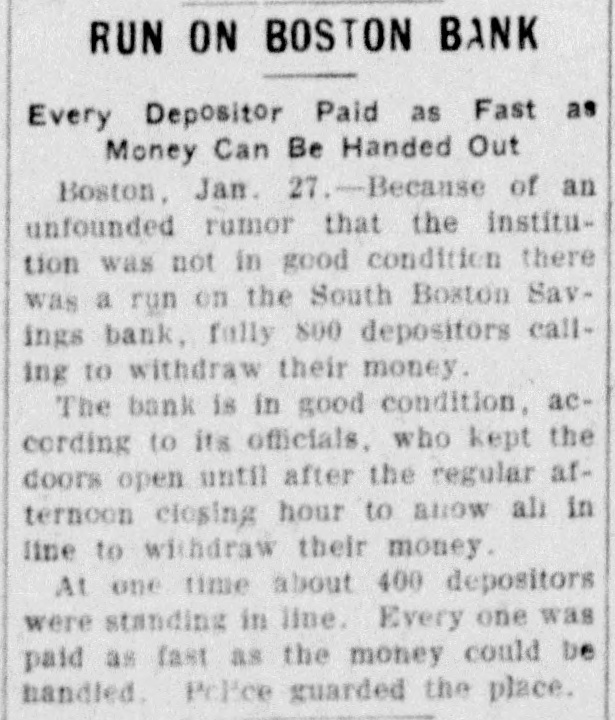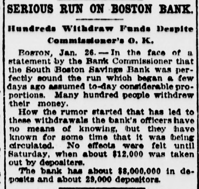 SERIOUS RUN ON BOSTON BANK. Hundreds Withdraw Funds Despite Commissioner's o. K. BOSTON, Jan. 26. - In the face of a statement by the Bank Commissioner that the South Boston Savings Bank was perfectly sound the run which began a few days ago assumed to-day considerable proportions. Many hundred people withdrew their money. How the rumor started that has led to these withdrawals the bank's officers have no means of knowing, but they have known for some time that it was (being circulated. No effects were felt until Saturday, when about $12,000 was taken out by depositers. The bank has about $8,000,000 in deposits and about 29,000 depositors.