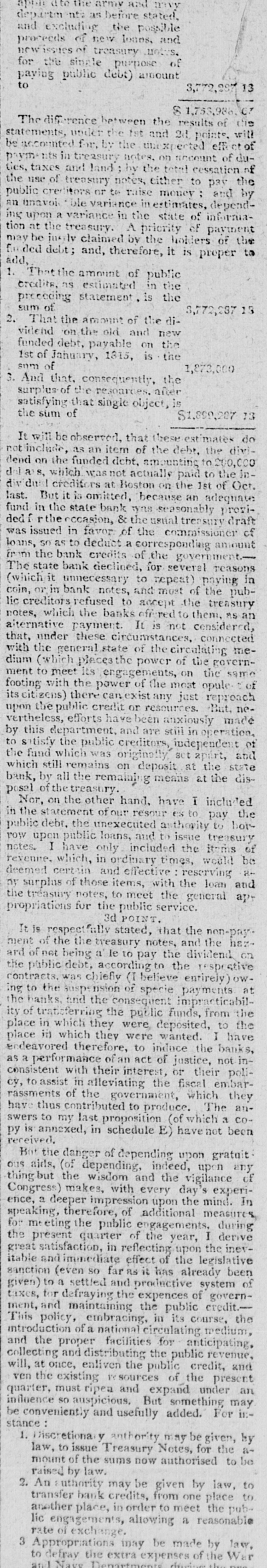 apple to the army and navy departments as before stated, and excluding the possible proceeds of new loans, and new issues of treasury notes. for the single purpose of paying public debt) amount to 3,772,297 13 $ 1,753,986, C7 The difference between the results of the statements, under the 1st and 2d points, will be accounted for, by the unexpected effect of payments in treasury notes, on account of du- ties, taxes and land; by the total cessation of the use of treasury notes, either to pay the public creditors or to raise money; and by an unavoidable variance in estimates, depend- ing upon a variance in the state of informa- tion at the treasury. A priority of payment may be justly claimed by the holders of the funded debt; and, therefore, it is proper to add, 1. That the amount of public credits, as estimated in the preceding statement, is the sum of 3,772,287 13 2. That the amount of the di- vidend on the old and new funded debt, payable on the 1st of January, 1815, is the sum of 1,873,000 3. And that, consequently, the surplus of the resources, after satisfying that single object, is the sum of $1,899,207 13 It will be observed, that these estimates do not include, as an item of the debt, the divi- dend on the funded debt, amounting to 200,000 dollars, which was not actually paid to the in- dividual creditors at Boston on the 1st of Oct. last. But it is omitted, because an adequate fund in the state bank was seasonably provi- ded for the occasion, & the usual treasury draft was issued in favor of the commissioner of loans, so as to deduct a corresponding amount from the bank credits of the government. The state bank declined, for several reasons (which it unnecessary to repeat) paying in coin, or in bank notes, and most of the pub- lic creditors refused to accept the treasury notes, which the banks offered to them, as an alternative payment. It is not considered, that, under these circumstances, connected with the general state of the circulating me- dium (which places the power of the govern- ment to meet its engagements, on the same footing with the power of the most opule of its citizens) there can exist any just reproach upon the public credit or resources. But, ne- vertheless, efforts have been anxiously made by this department, and are still in operation, to satisfy the public creditors, independent of the fund which was originally set apart, and which still remains on deposit at the state bank, by all the remaining means at the dis- posal of the treasury. Nor, on the other hand, have I included in the statement of our resources to pay the public debt, the unexecuted authority to bor- row upon public loans, and to issue treasury notes. I have only included the items of revenue, which, in ordinary times, would be deemed certain and effective: reserving a- ny surplus of those items, with the loan and the treasury notes, to meet the general ap- propriations for the public service. 3d POINT. It is respectfully stated, that the non-pay- ment of the the treasury notes, and the haz- ard of not being able to pay the dividend on the public debt, according to the respective contracts, was chiefly (I believe entirely) ow- ing to the suspension of specie payments at the banks, and the consequent impracticabil- ity of transferring the public funds, from the place in which they were deposited, to the place in which they were wanted. I have endeavored therefore, to induce the banks, as a performance of an act of justice, not in- consistent with their interest, or their poli- cy, to assist in alleviating the fiscal embar- rassments of the government, which they have thus contributed to produce. The an- swers to my last proposition (of which a co- py is annexed, in schedule E) have not been received, But the danger of depending upon gratuit- ous aids, (of depending, indeed, upon any thing but the wisdom and the vigilance of Congress) makes, with every day's experi- ence, a deeper impression upon the mind. In speaking, therefore, of additional measures for meeting the public engagements, during the present quarter of the year, I derive great satisfaction, in reflecting upon the inev- itable and immediate effect of the legislative sanction (even so far as it has already been given) to a settled and productive system of taxes, for defraying the expences of govern- ment and maintaining the public credit. This policy, embracing, in its course, the introduction of a national circulating medium, and the proper facilities for anticipating, collecting and distributing the public revenue, will, at once, enliven the public credit, and even the existing resources of the present quarter, must ripen and expand under an influence so auspicious. But something may be conveniently and usefully added. For in- stance: 1. Discretionary authority may be given, by law, to issue Treasury Notes, for the a- mount of the sums now authorised to be raised by law. 2. An authority may be given by law, to transfer bank credits, from one place to another place, in order to meet the pub- lic engagements, allowing a reasonable rate of exchange. 3 Appropriations may be made by law, to defray the extra expenses of the War and Navy Departments during the pre-